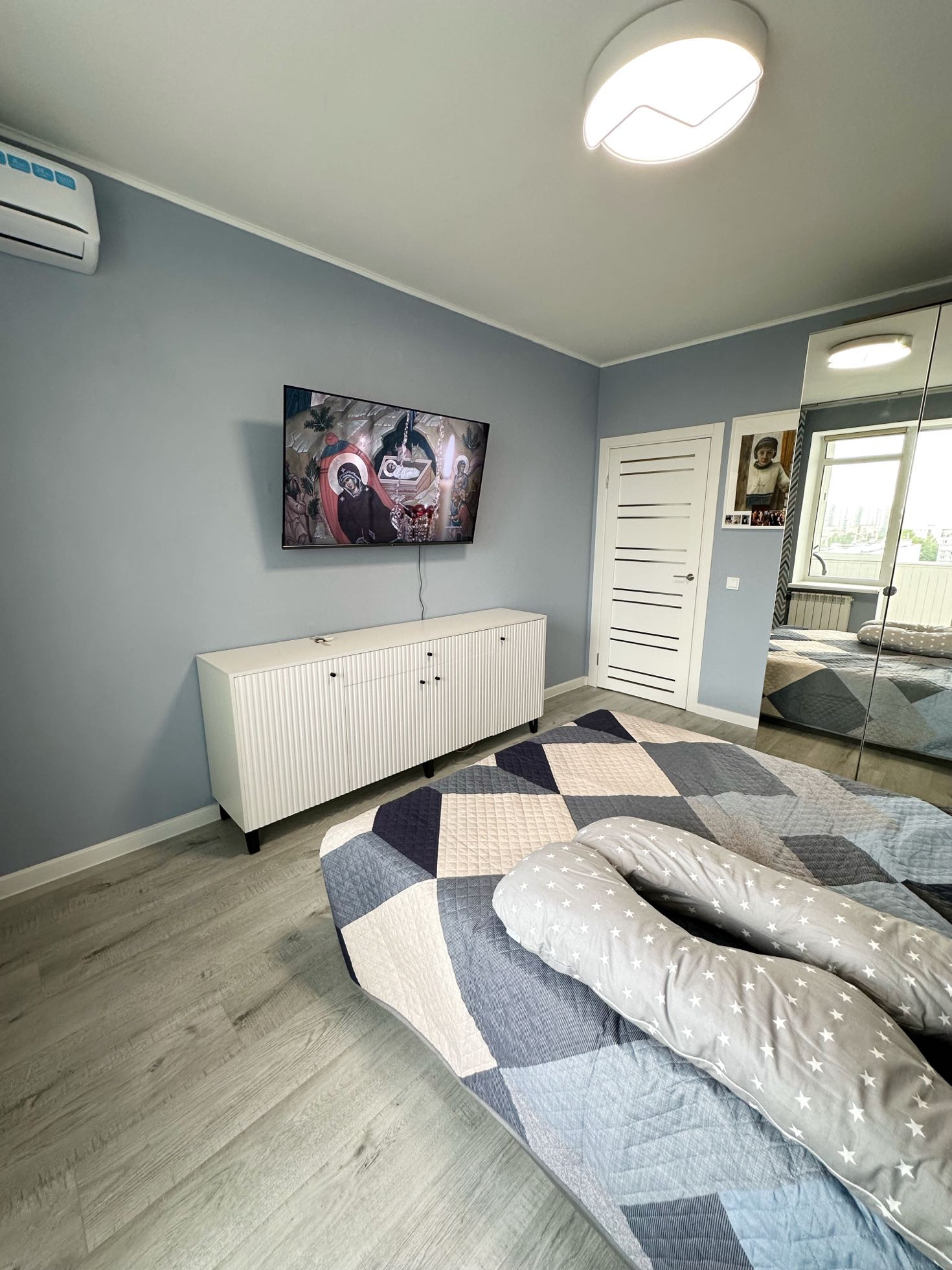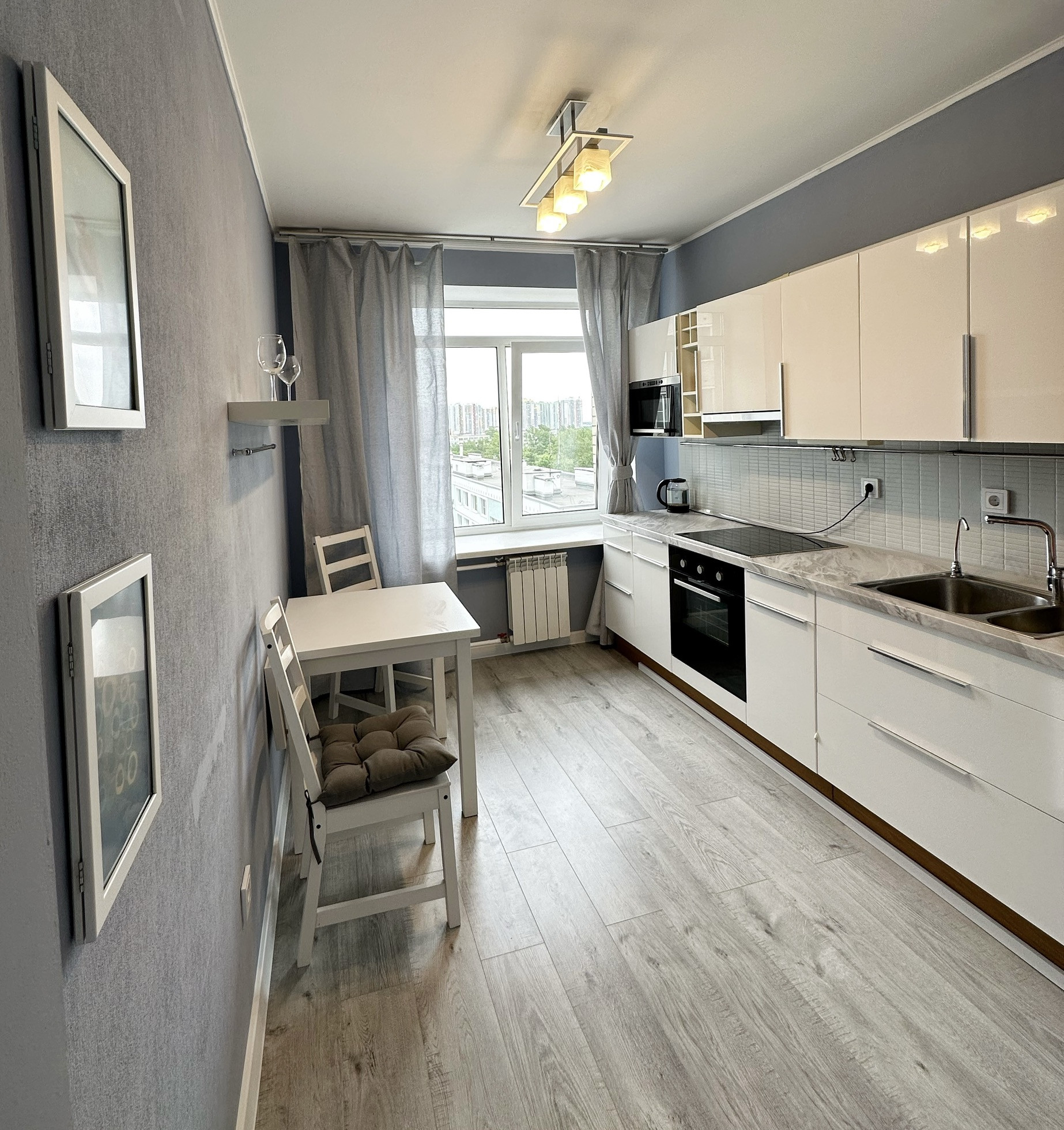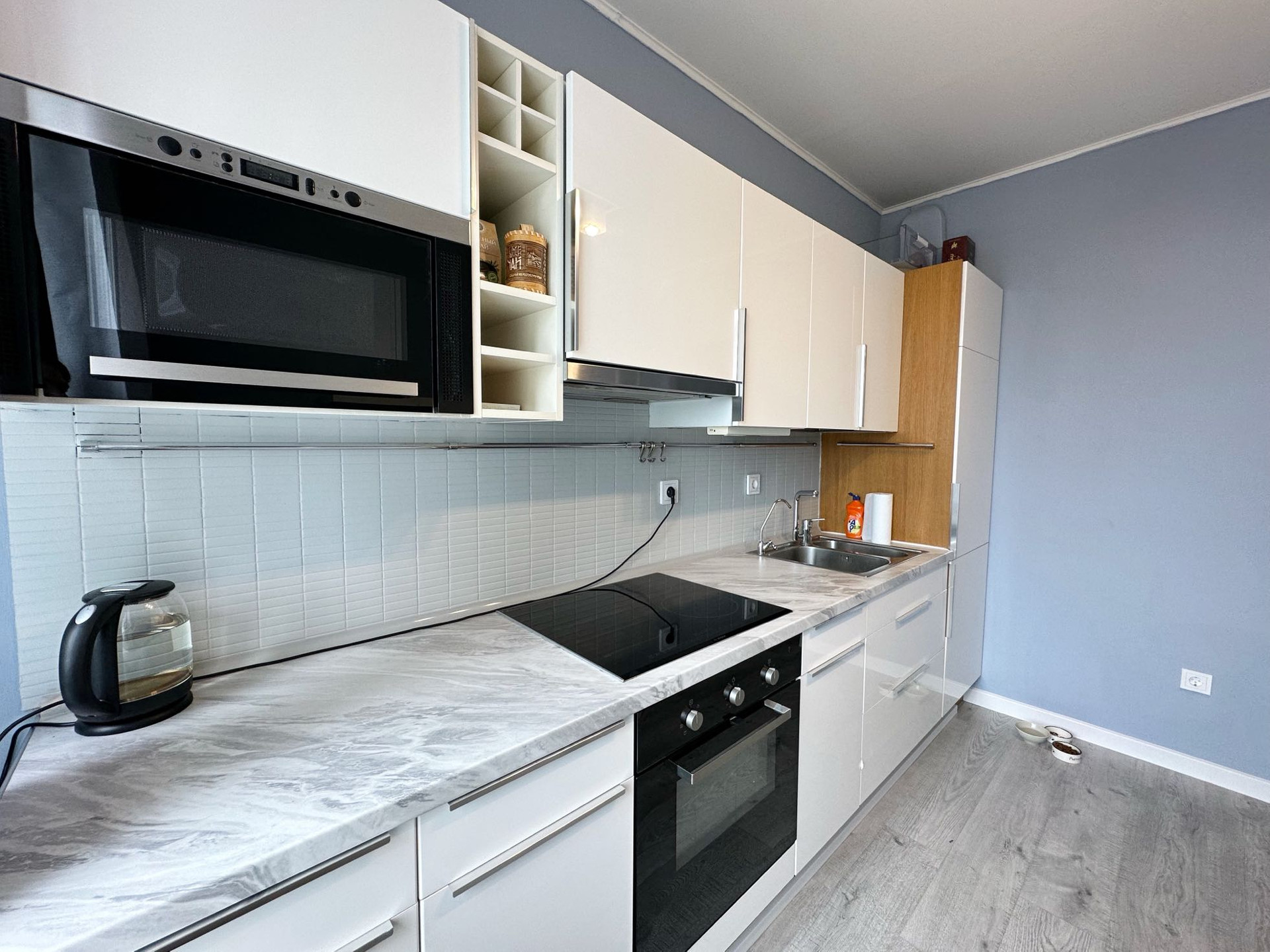 Встроенная кухня ikea, посудомоечная машина ikea, встроенный холодильник ikea и микроволновка ikea, кондиционер, индукционная плита, духовка, стиральная машина - все фирмы bosh. На полу дорогой хороший ламинат.