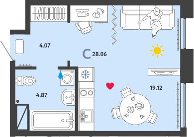 Студия с очень удачной планировкой. В ней 2 увеличенных окна, это позволяет зонировать пространство. Квартира подходит как для собственного проживания, так и для сдачи в аренду.