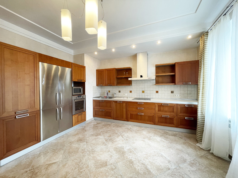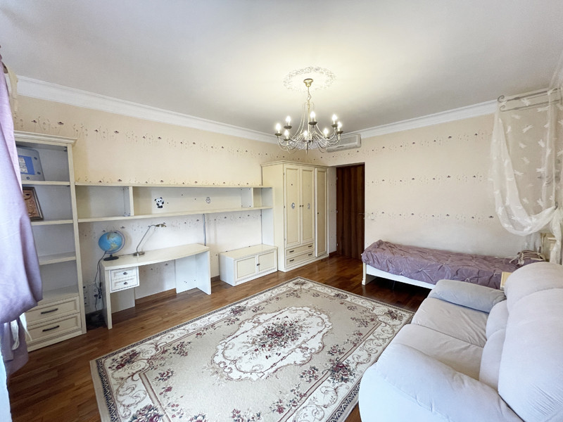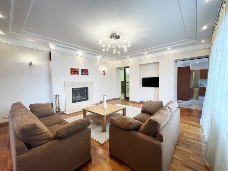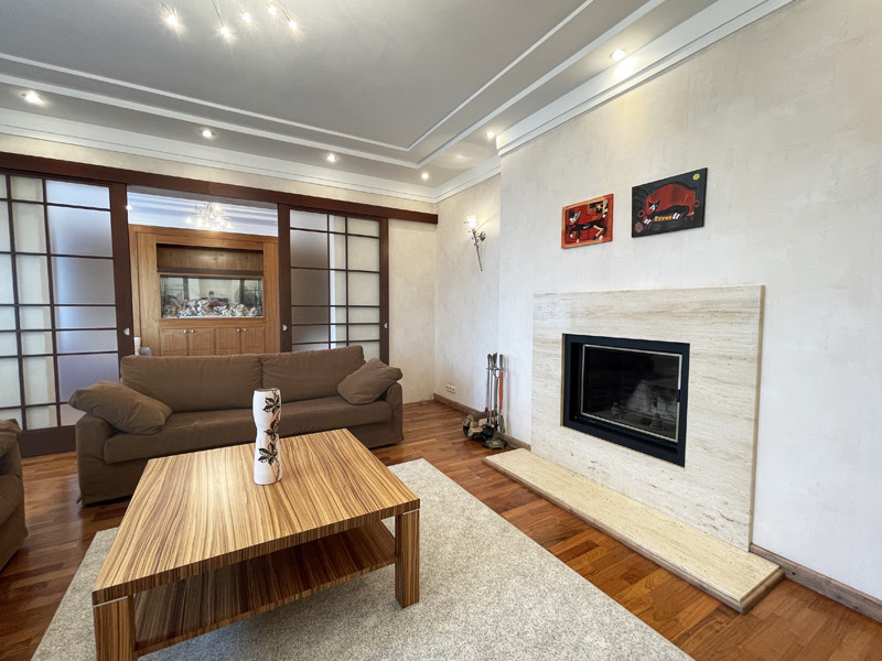 Кратко: 4 комнаты, потолки 3 метра, отделка из дорогих материалов в идеальном состоянии, мебель входит в стоимость, настоящий дровяной камин, сауна, джакузи, отдельная гардеробная, хороший вид из окон, гараж на 2 автомобиля с кладовкой, мастерской и водоснабжением (гараж оплачивается дополнительно).