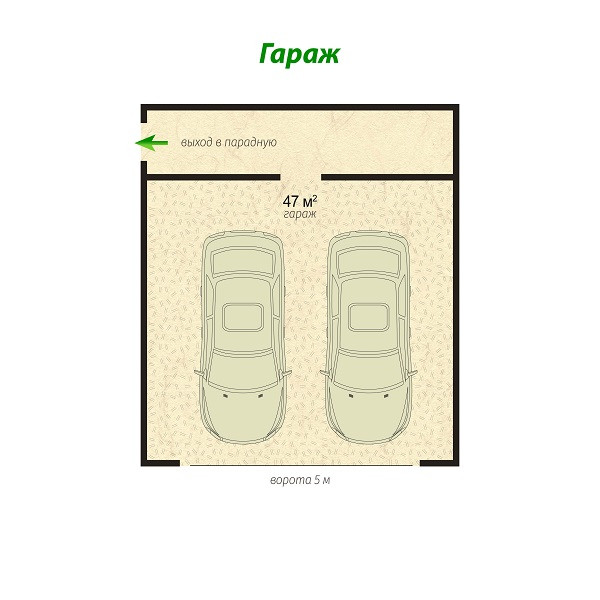 На 1 этаже дома расположен гараж 47 м2 на 2 автомобиля с кладовкой, в гараже есть отопление, водоснабжение и канализация, выход из гаража прямо в парадную (гараж оплачивается дополнительно).