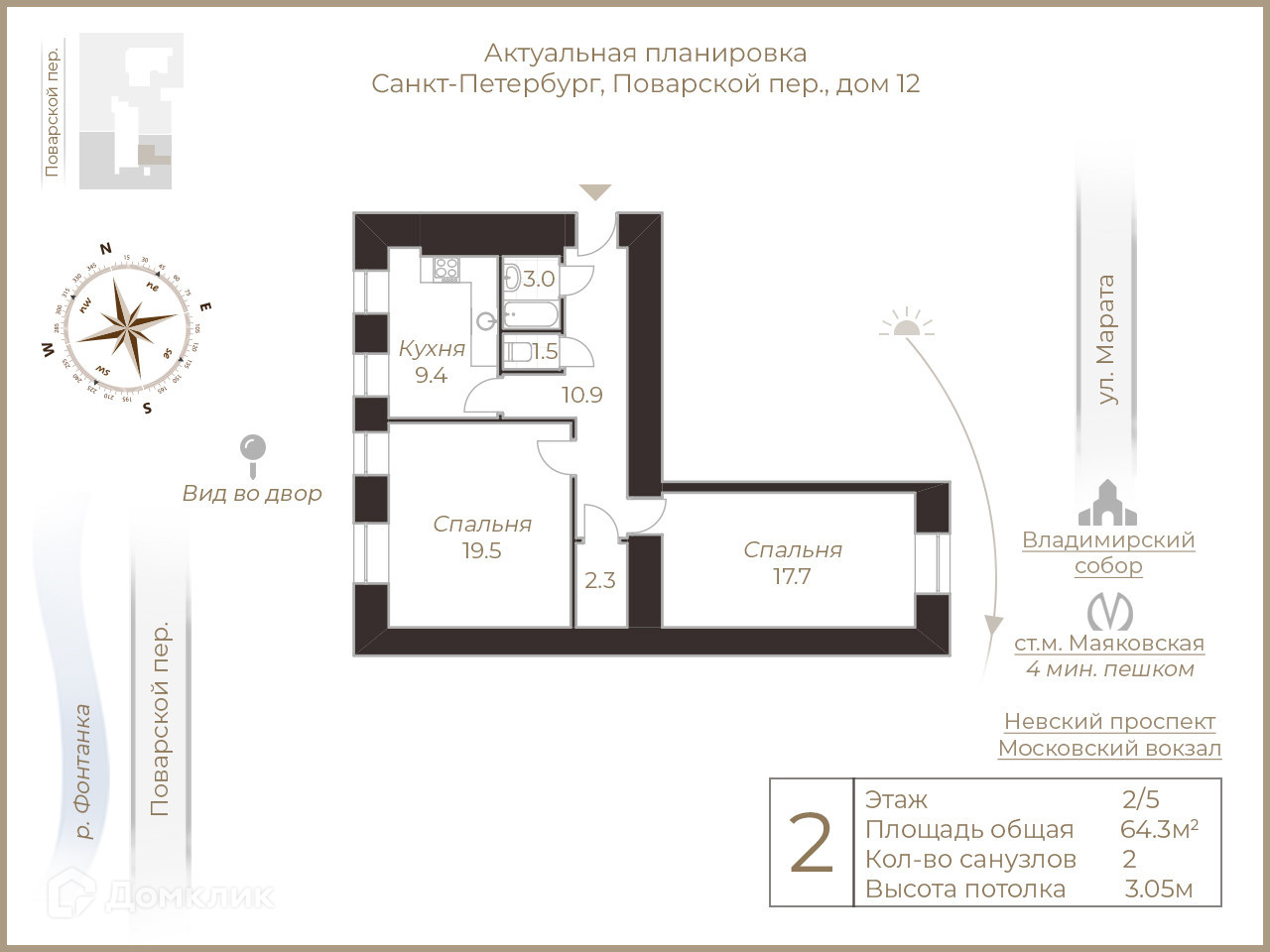 2-комнатная квартира, 64.3 м2, этаж 2 / 5, на продажу в Санкт-Петербурге, Поварской переулок, 12