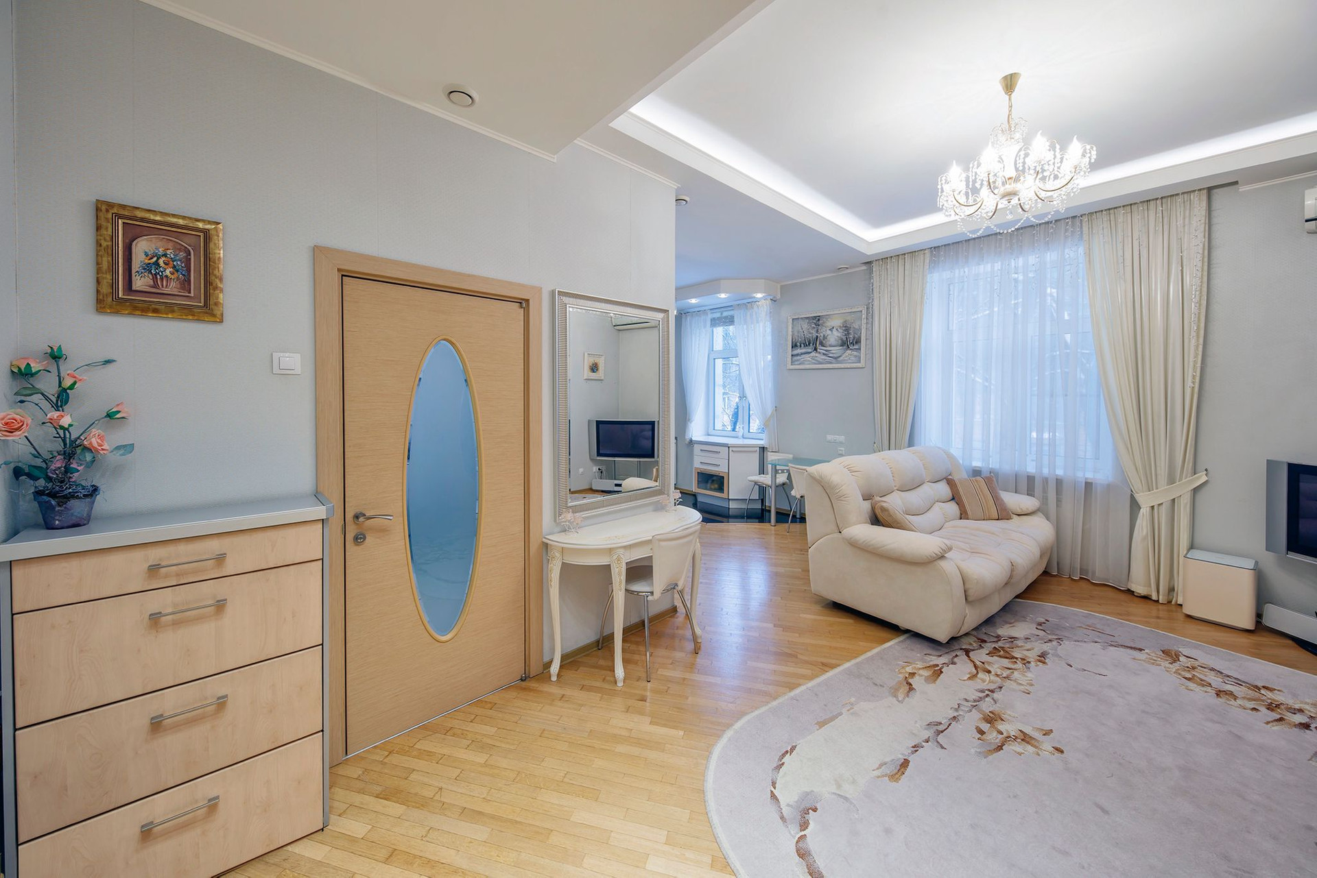 В доме к продаже представлена двухкомнатная квартира на втором этаже, по факту трехкомнатная квартира с гостиной - столовой, спальней и гостевой комнатой.  Просторная ванная комната 10м с джакузи. Высота  потолков 3м.