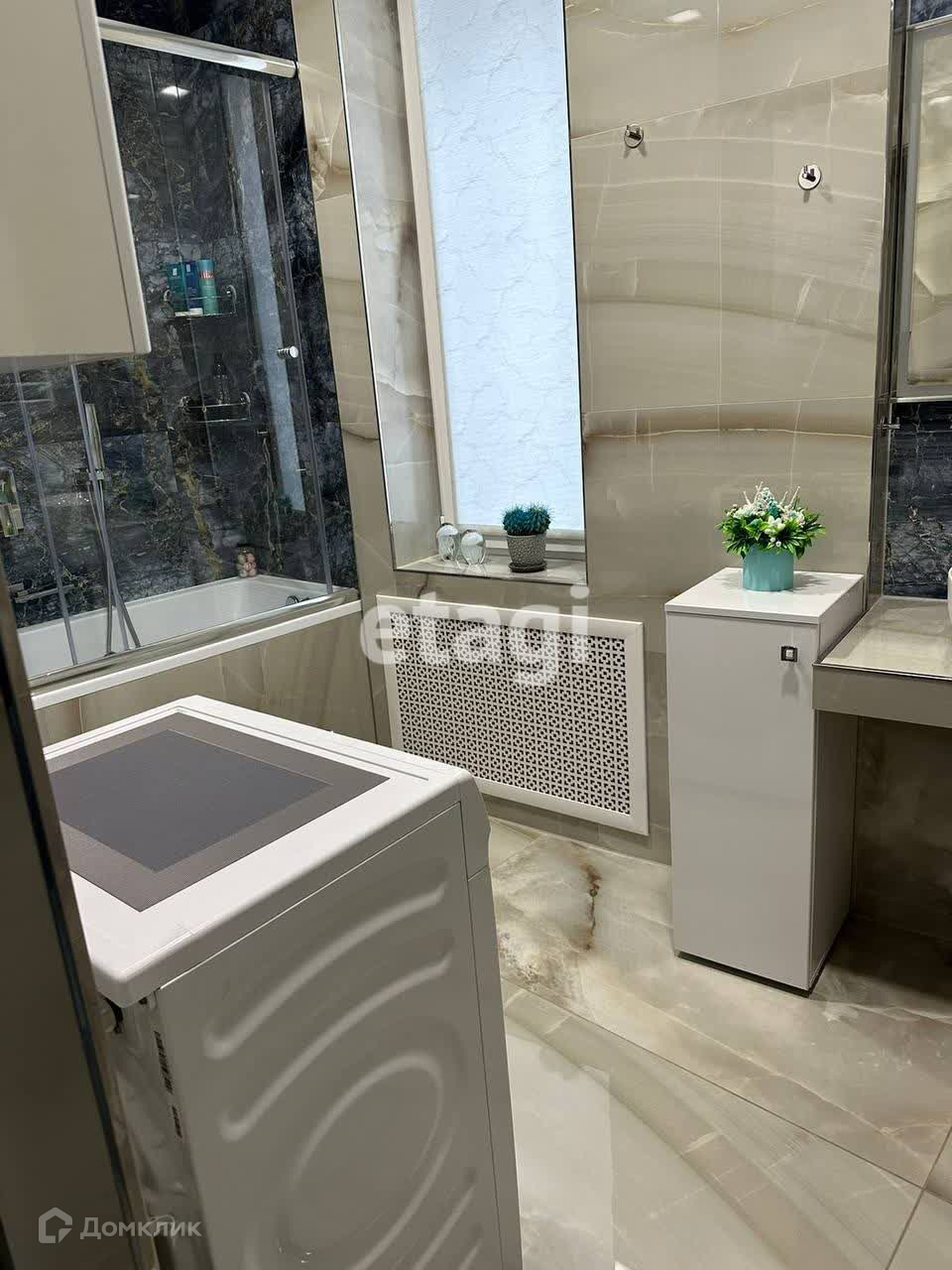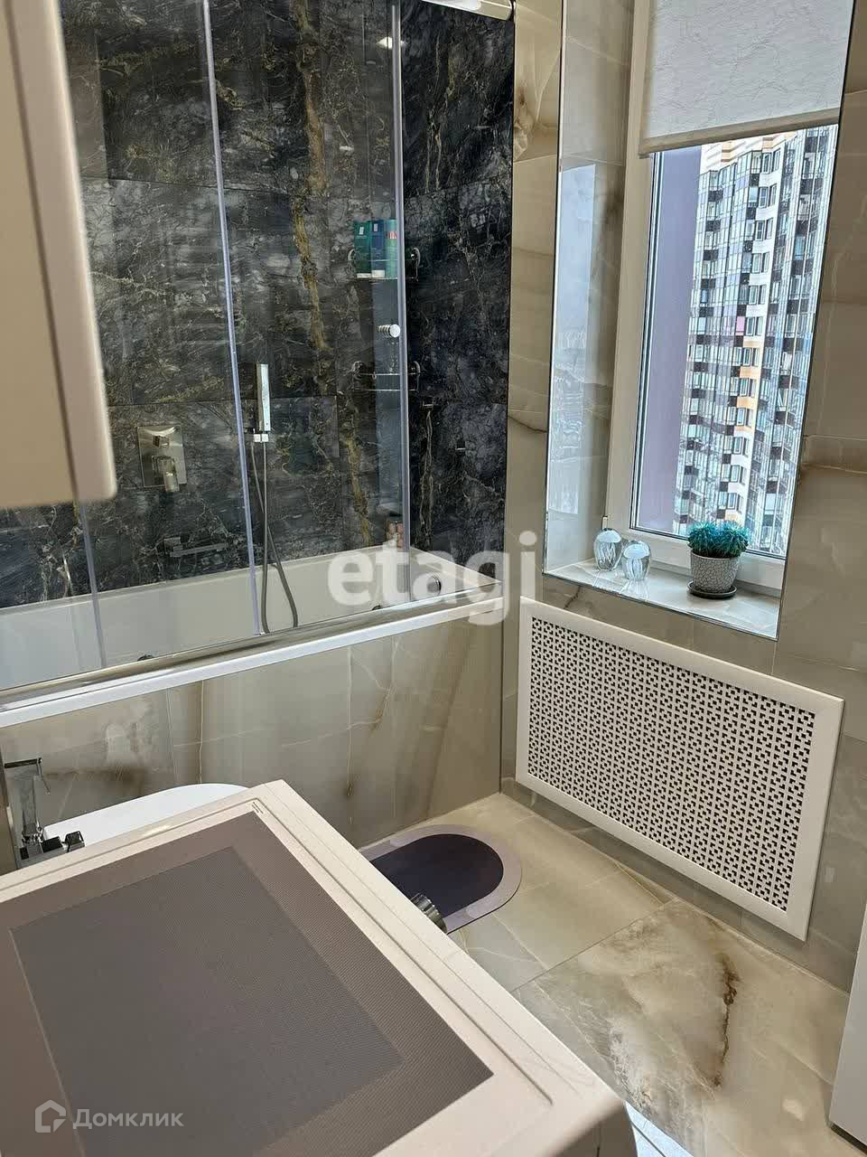 Ванная в окном ( 6 кв.м, теплый пол и радиатор).Прихожая со встроенной гардеробной и мебелью. Кухня 11,8 кв. м. с мебелью и техникой, выходом на лоджию (3,6 кв.м, на лоджии натяжной потолок, пол