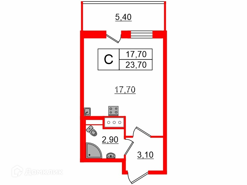 Общая площадь 23.7 м2