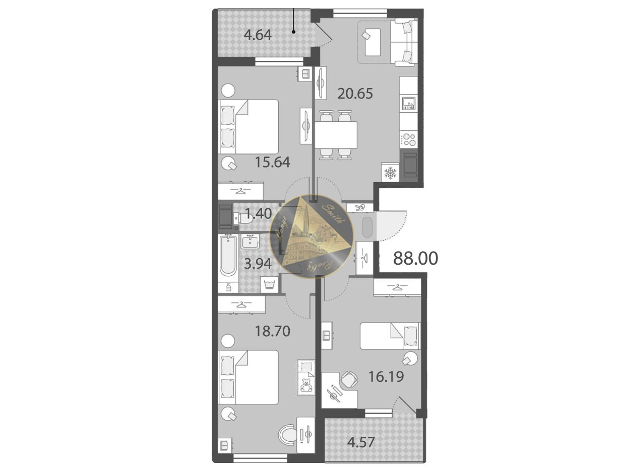 - Общая площадь квартиры 88.00 м2.