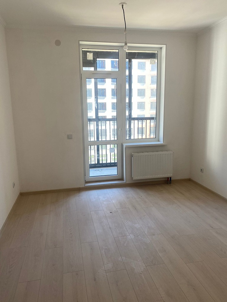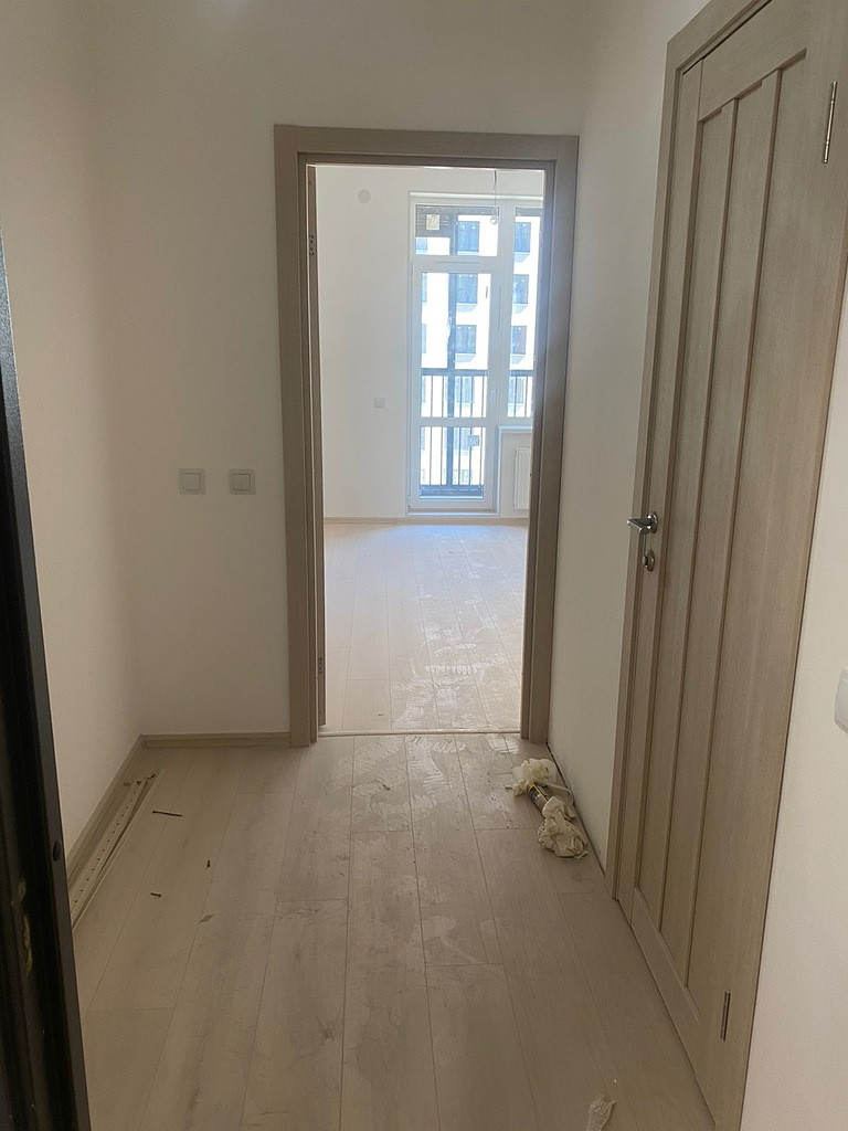 В квартире выполнена полная чистовая отделка в светлых тонах, на стенах в комнате и прихожей - обои под покраску, полы ламинат, установлены все розетки и выключатели.