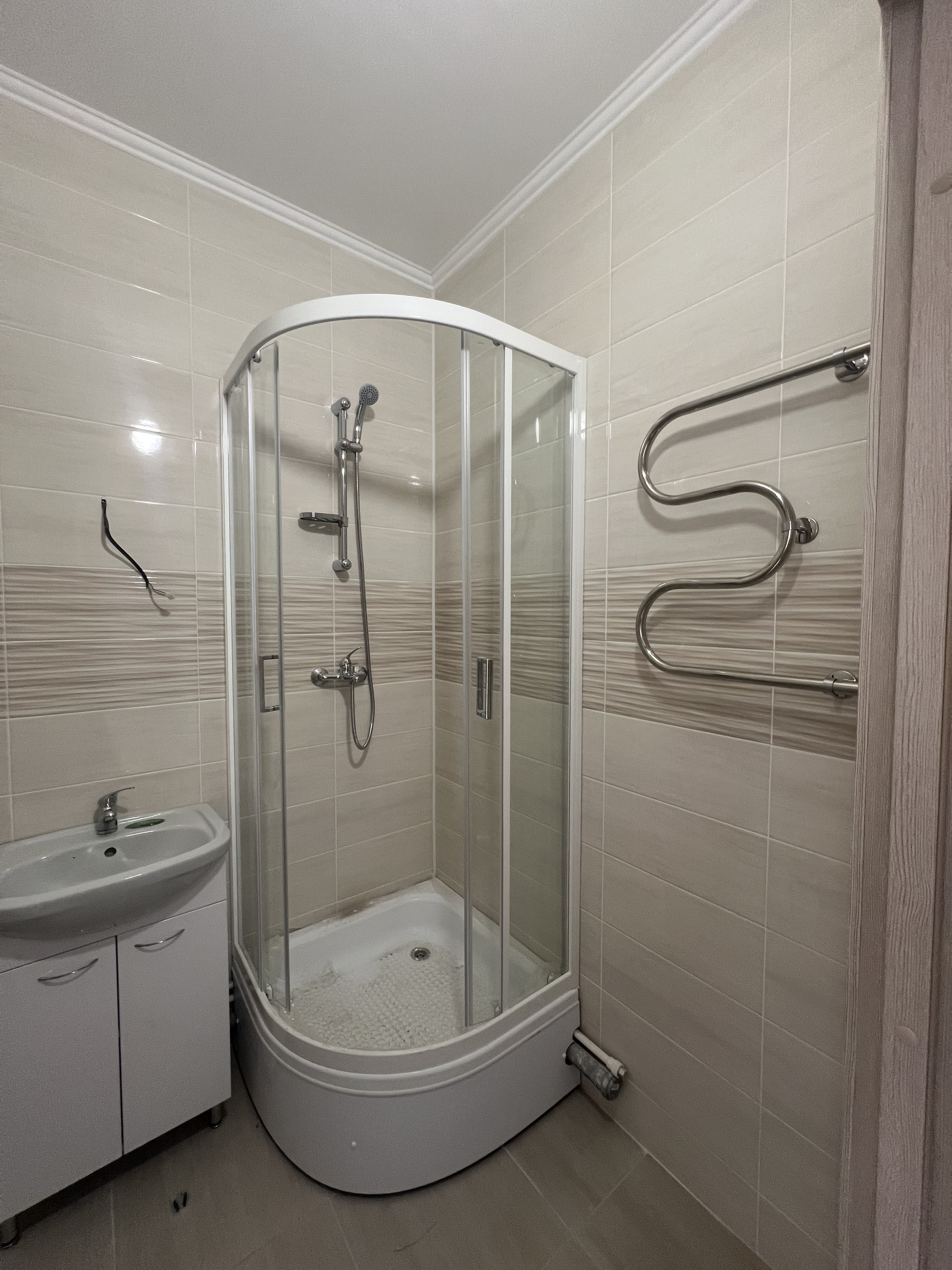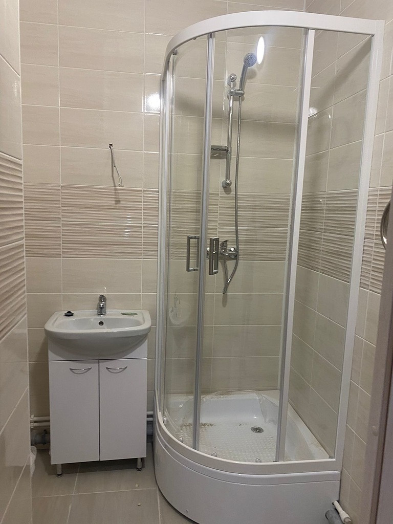 В ванной комнате кафельная плитка на стенах и полу, установлена душевая кабина, раковина с тумбой и унитаз-компакт.