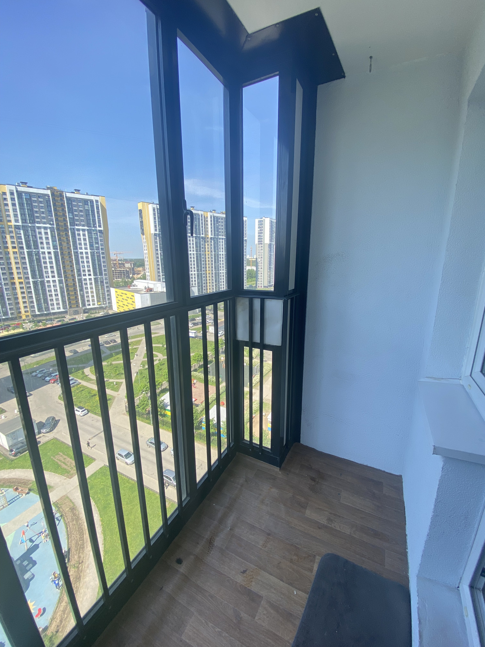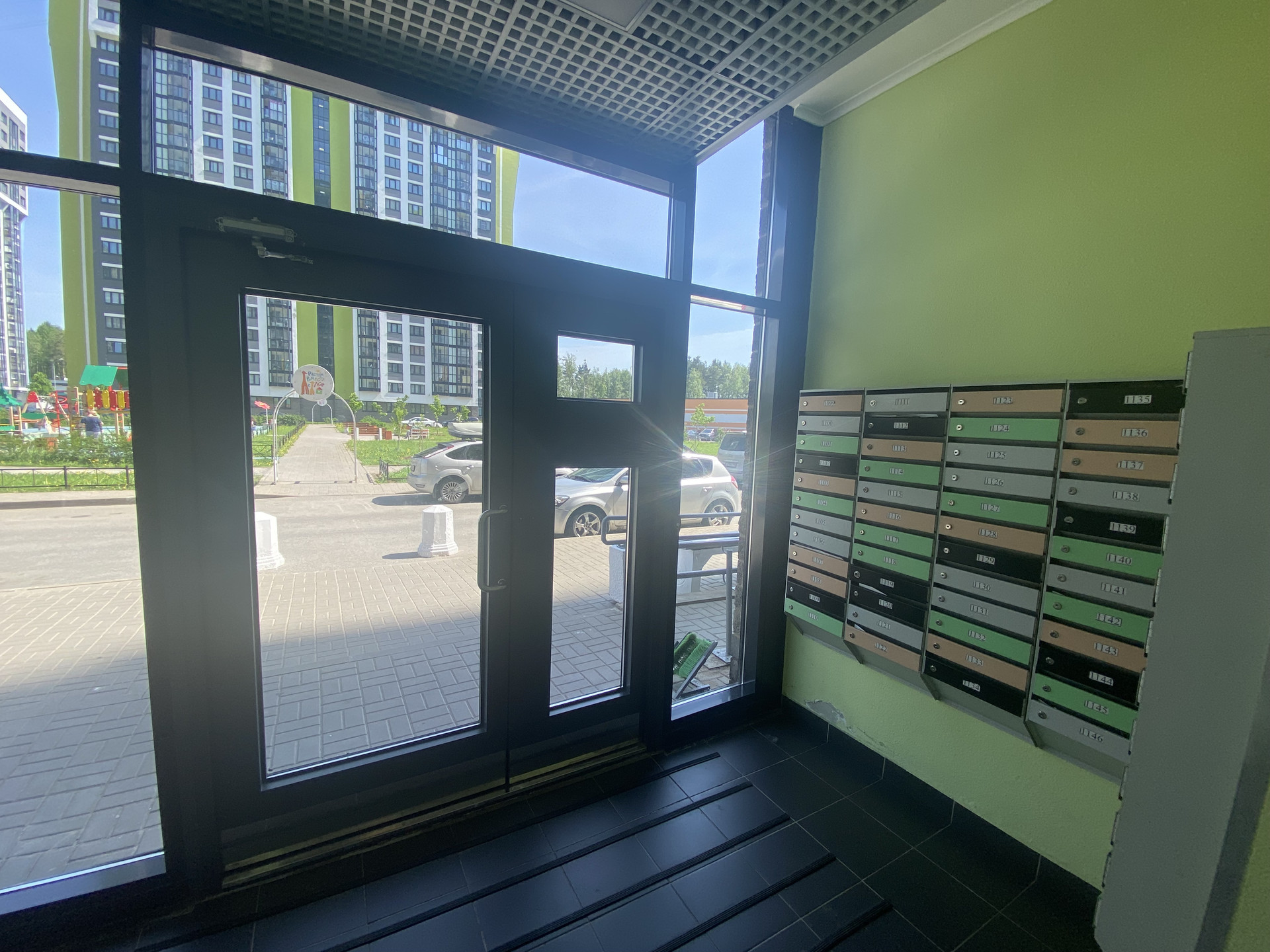 Дом находится в глубине жилого комплекса, окна выходят во двор, на детскую площадку. За счет расположения в квартире будет тихо и вы не будете слышать шум от дороги и под окнами не будут постоянного, активного движения. Также это вас защитит от лишней пыли.