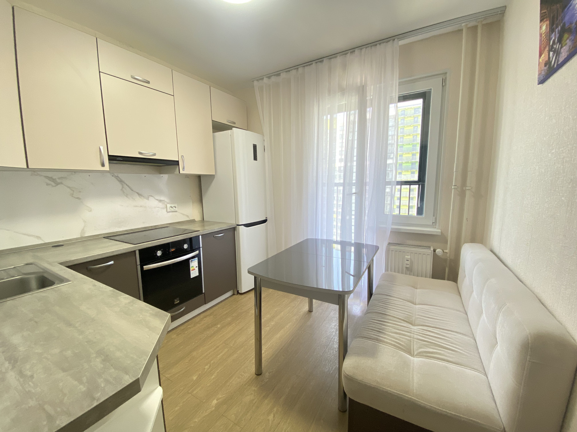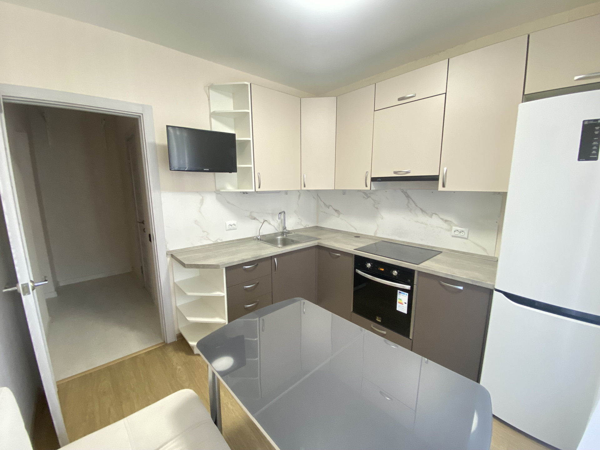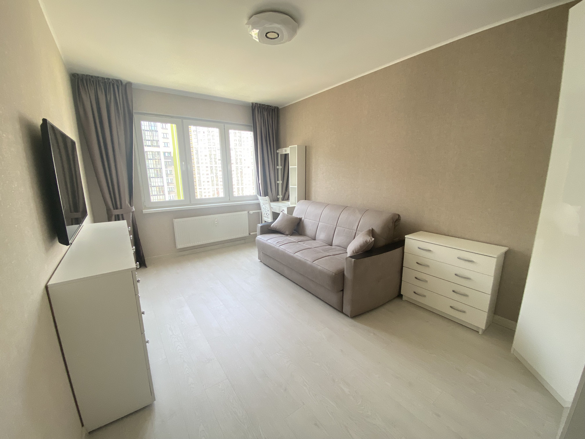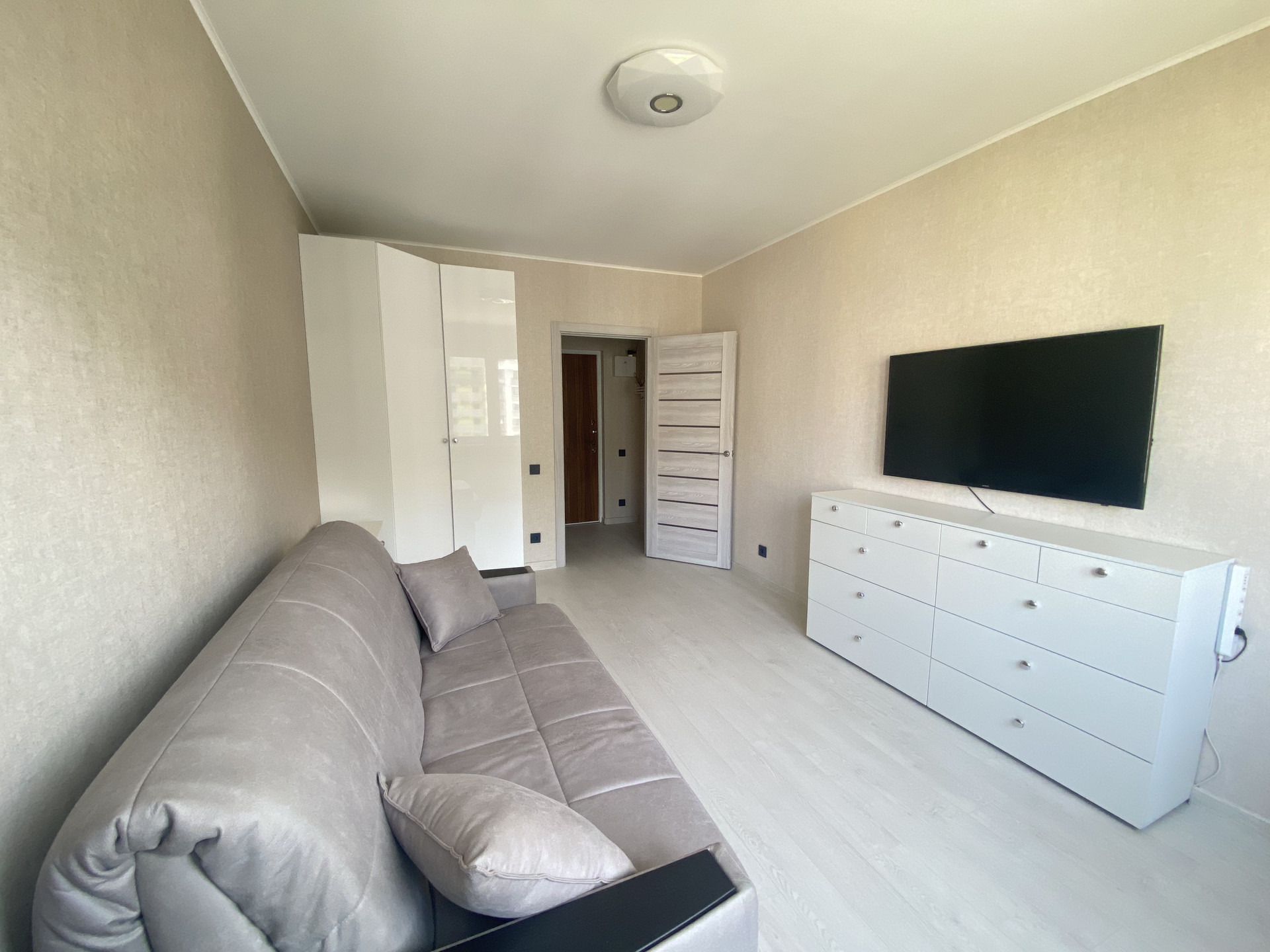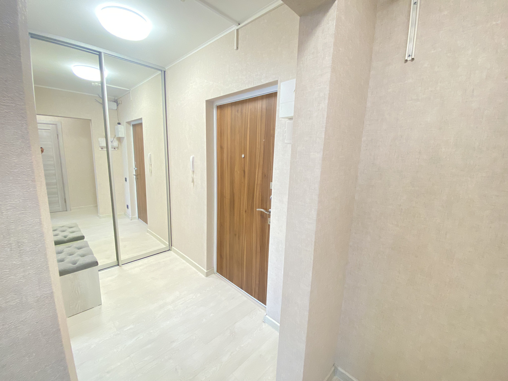 Квартира расположена на 13-ом этаже из 20. Светлая комната 14,5 м, квадратная кухня 8 м с выходом на застекленную лоджию. Просторный коридор, где уже есть большой шкаф-купе для хранения вещей и дополнительное место, где можно организовать рабочую зону, спортивный уголок или разместить еще один шкаф. Санузел совмещеный, установлена большая угловая ванна.