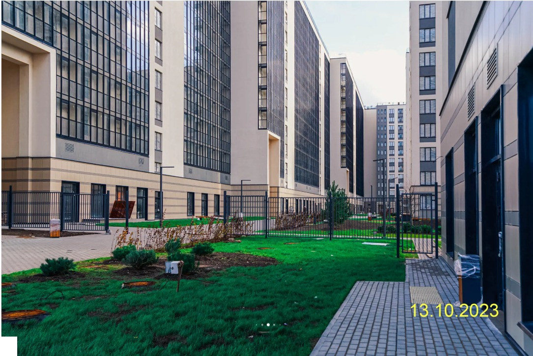 Закрытая территория с благоустроенным зеленым двором.