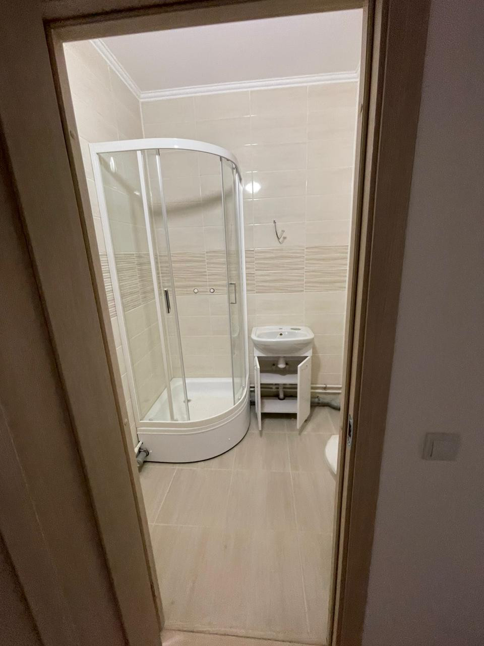 В ванной комнате - кафельная плитка на стенах и полу, установлены душевая кабина, раковина с тумбой и компактный унитаз.