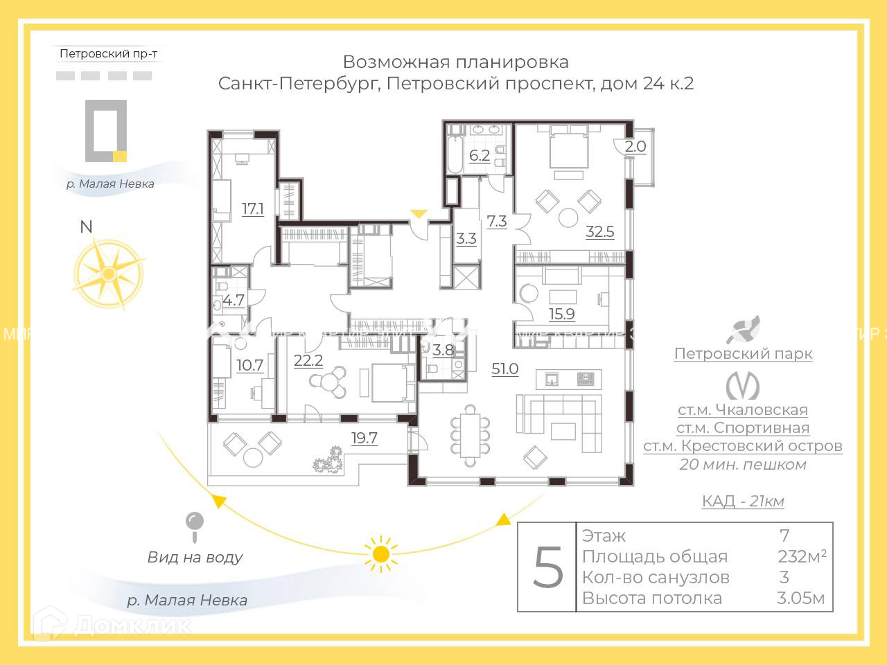 5-комнатная квартира, 232 м2, этаж 7 / 8, на продажу в Санкт-Петербурге, Петровский проспект, 24к2
