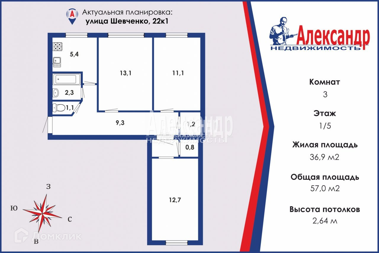 3-комнатная квартира, 57 м2, этаж 1 / 5, на продажу в Санкт-Петербурге, улица Шевченко, 22к1