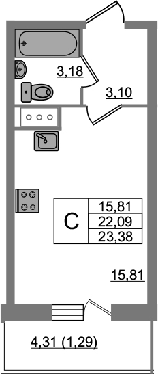 Общая площадь 23.38 м2