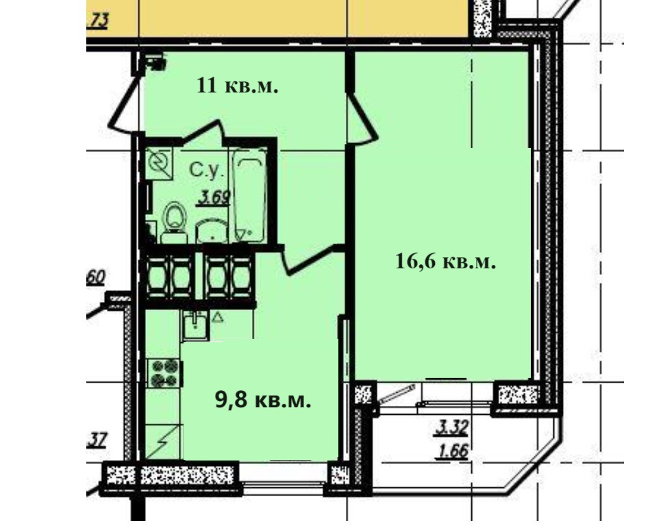 Жилая площадь 16.6 м2