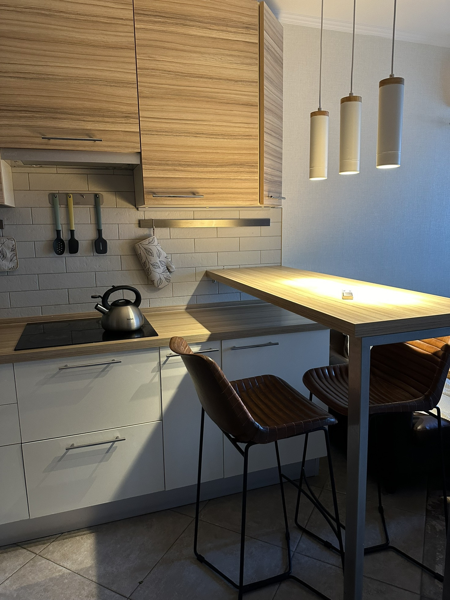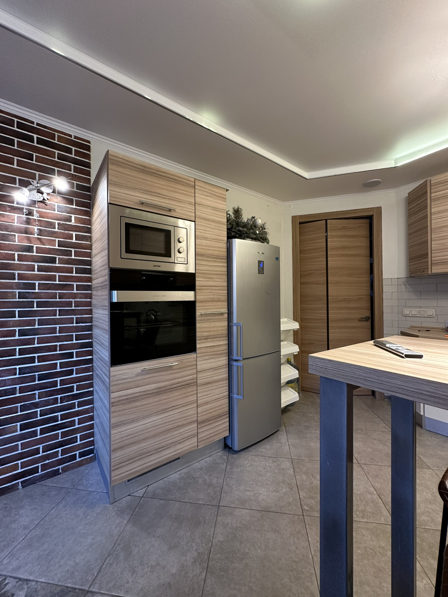 Угловая кухня фирмы «Мария» с барной стойкой и отдельно стоящая консоль под технику.