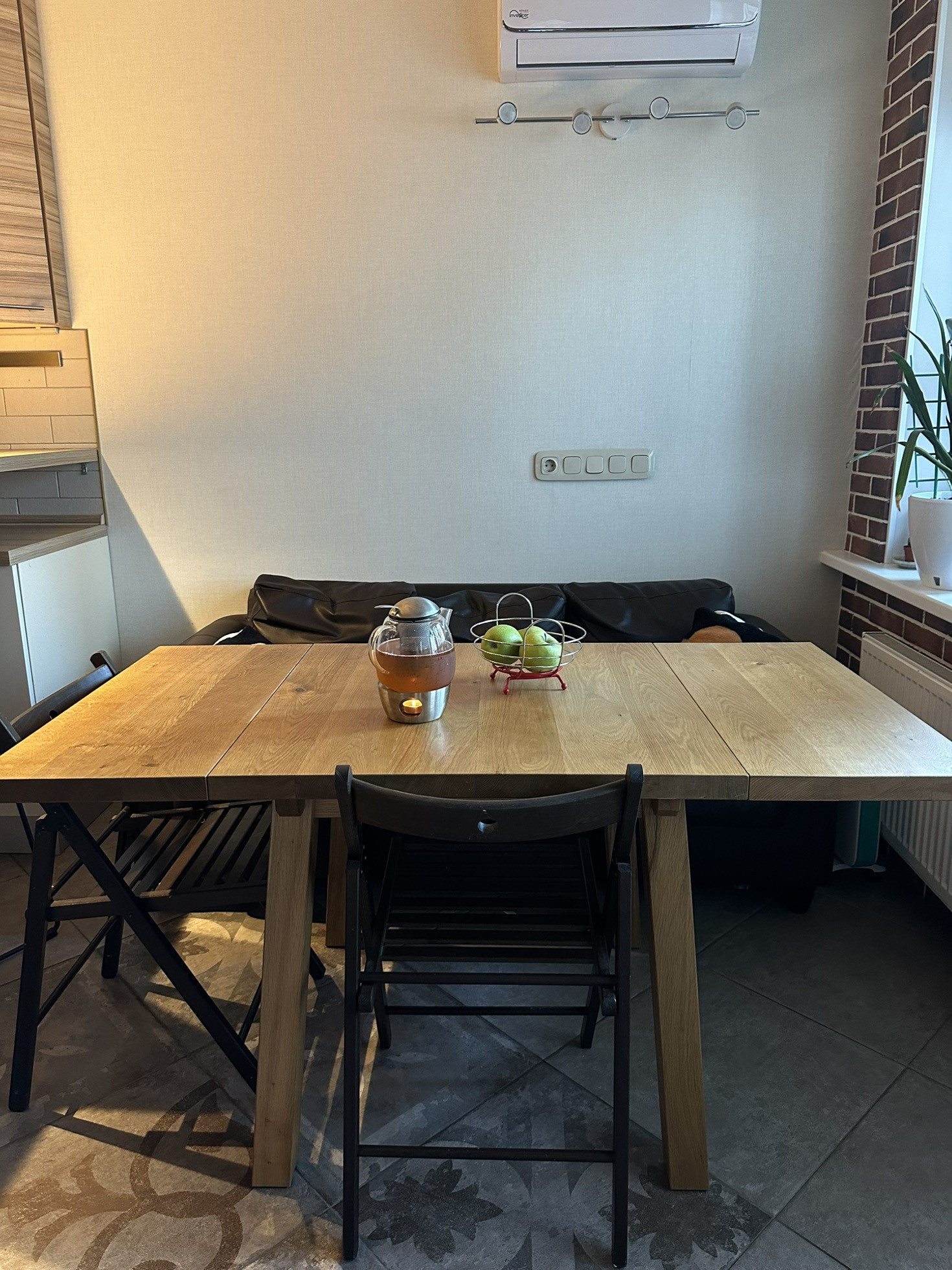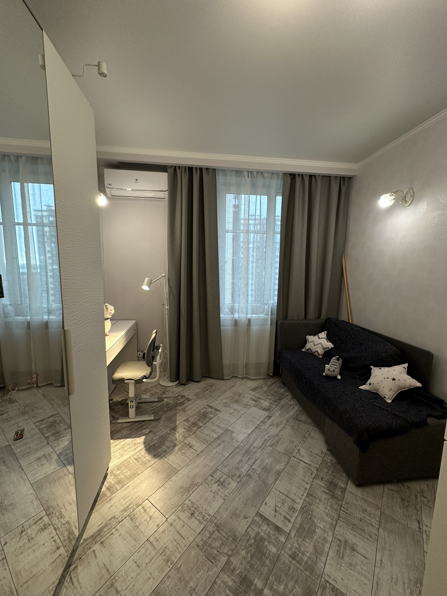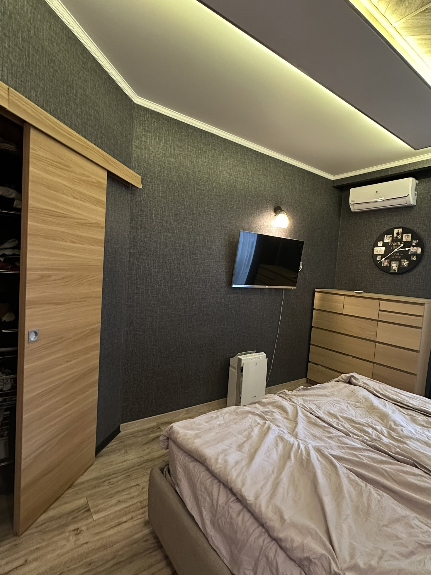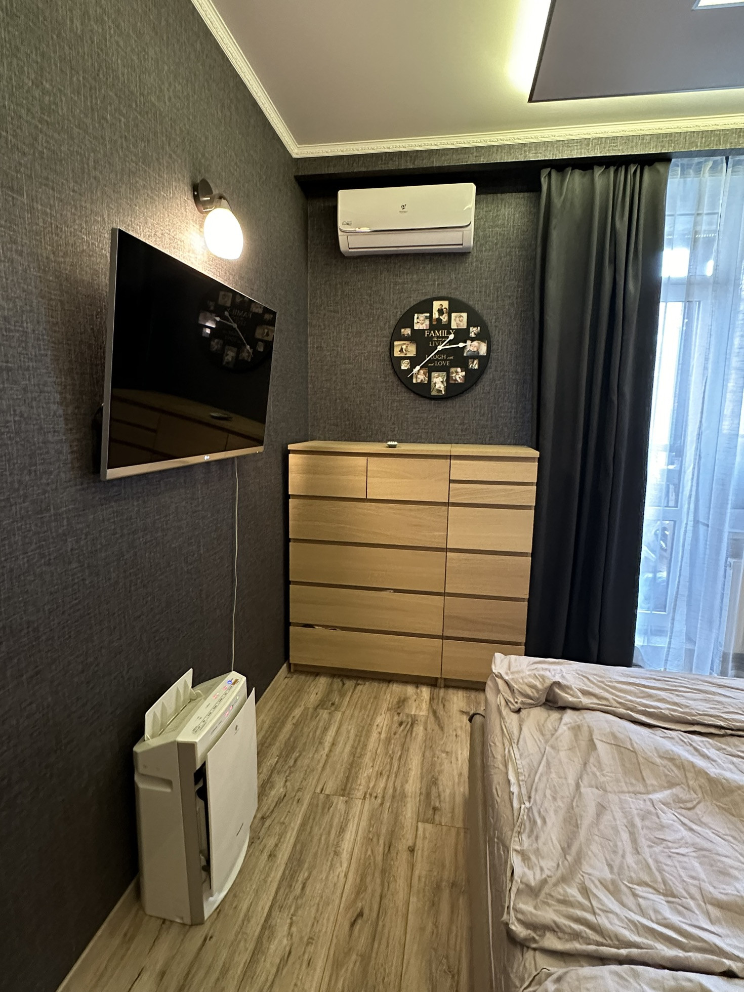 Инвертерные кондиционеры в спальнях и на кухне, с размещением трех наружных на балконах для удобства обслуживания.