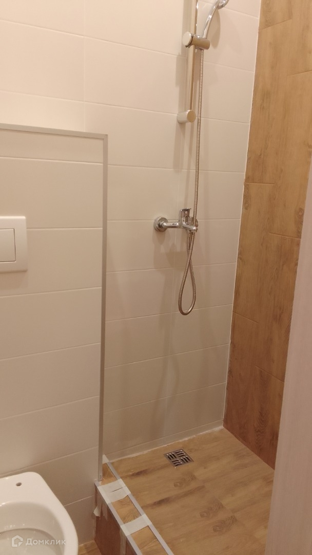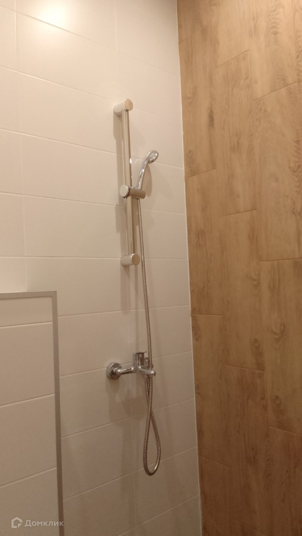 Санузел в кафеле, оборудован сантехникой и душевой.