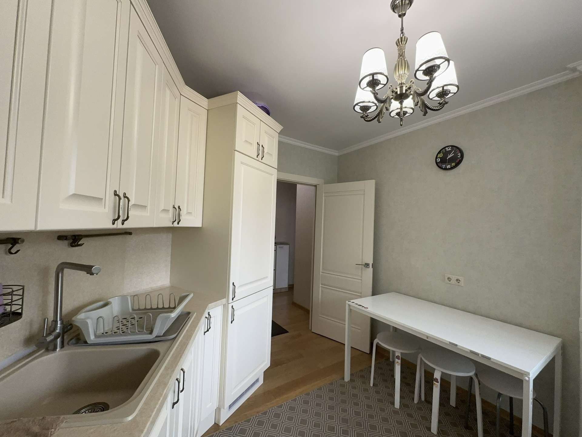 В квартире выполнен современный ремонт с использованием высококачественных, дорогих материалов. Надежная входная дверь. На кухне установлен качественный кухонный гарнитур со встроенным холодильником.