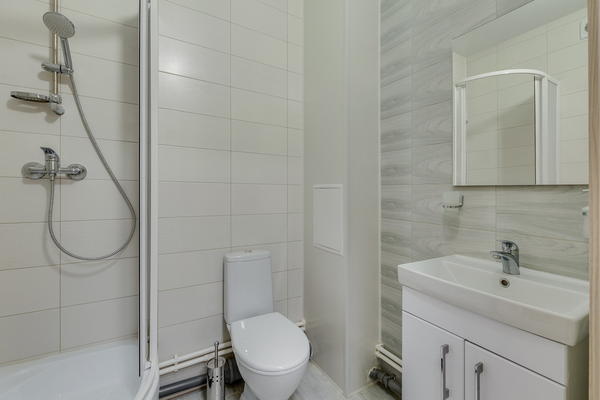 - санузел совместный, установлена комфортная душевая кабина, теплый пол, установлена стиральная машина.