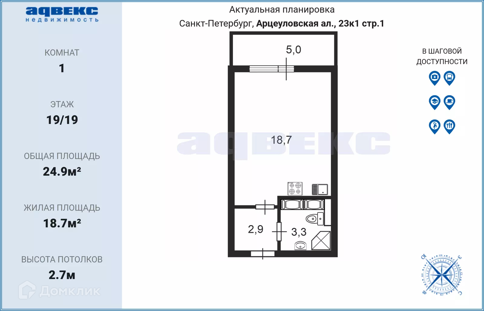 Жилая площадь - 18,7м2, совмещенный санузел 3,3м2, коридор 2,9м2.