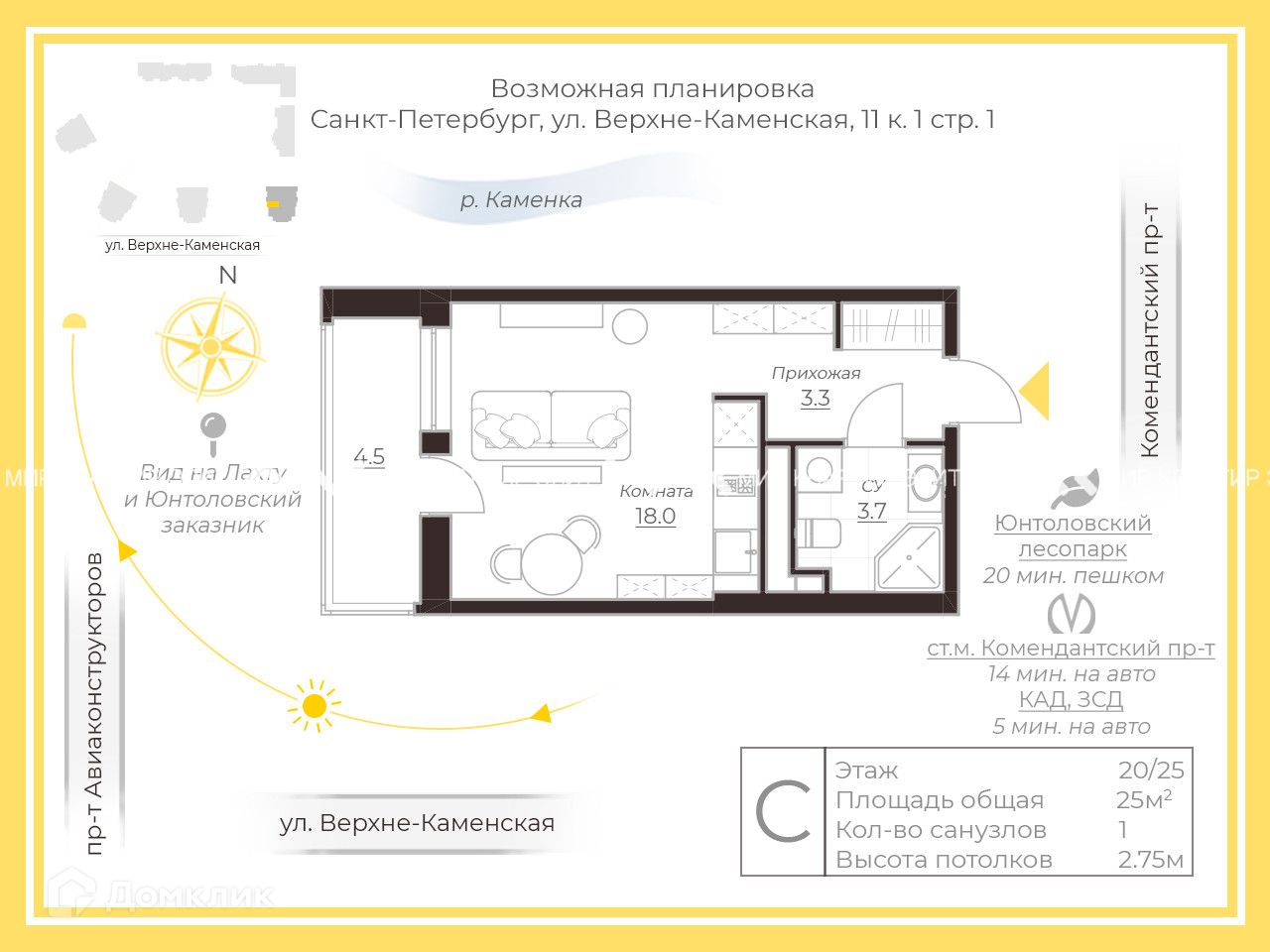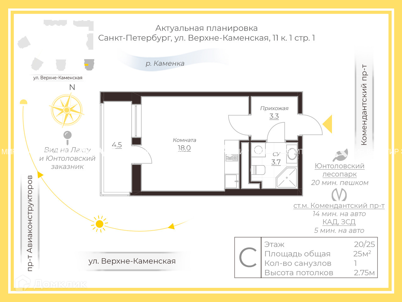 Квартира студия, 25 м2, этаж 20 / 25, на продажу в Санкт-Петербурге, Верхне-Каменская улица, 11к1