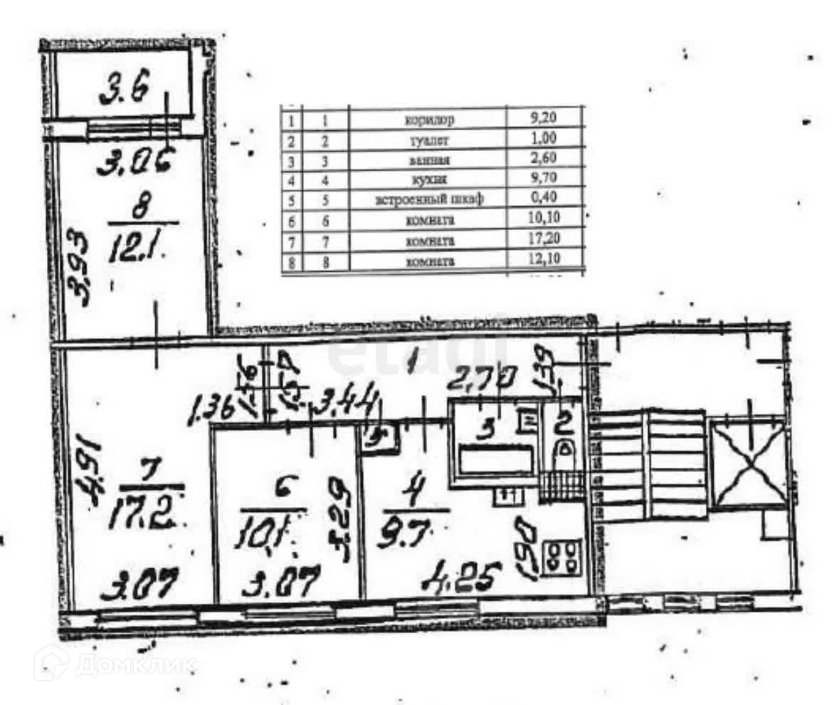 При входе в квартиру расположены туалет, ванная, а чуть далее вход в кухню. Сохранён встроенный шкаф рядом с кухней и антресоли в коридоре и на кухне. Далее по коридору вход в комнаты 7 (17,2 кв.м.) и 8 (12,1 кв.м.) плана и дверь в комнату 6 (10,1 кв.м.). В данной комнате осуществлён косметический ремонт, заменена батарея и установлено пластиковое окно. При входе в комнату 7 смонтирован встроенный шкаф/кладовка. Из комнаты 8 плана расположен выход на лоджию (последняя фотография 3,6 кв.м.).