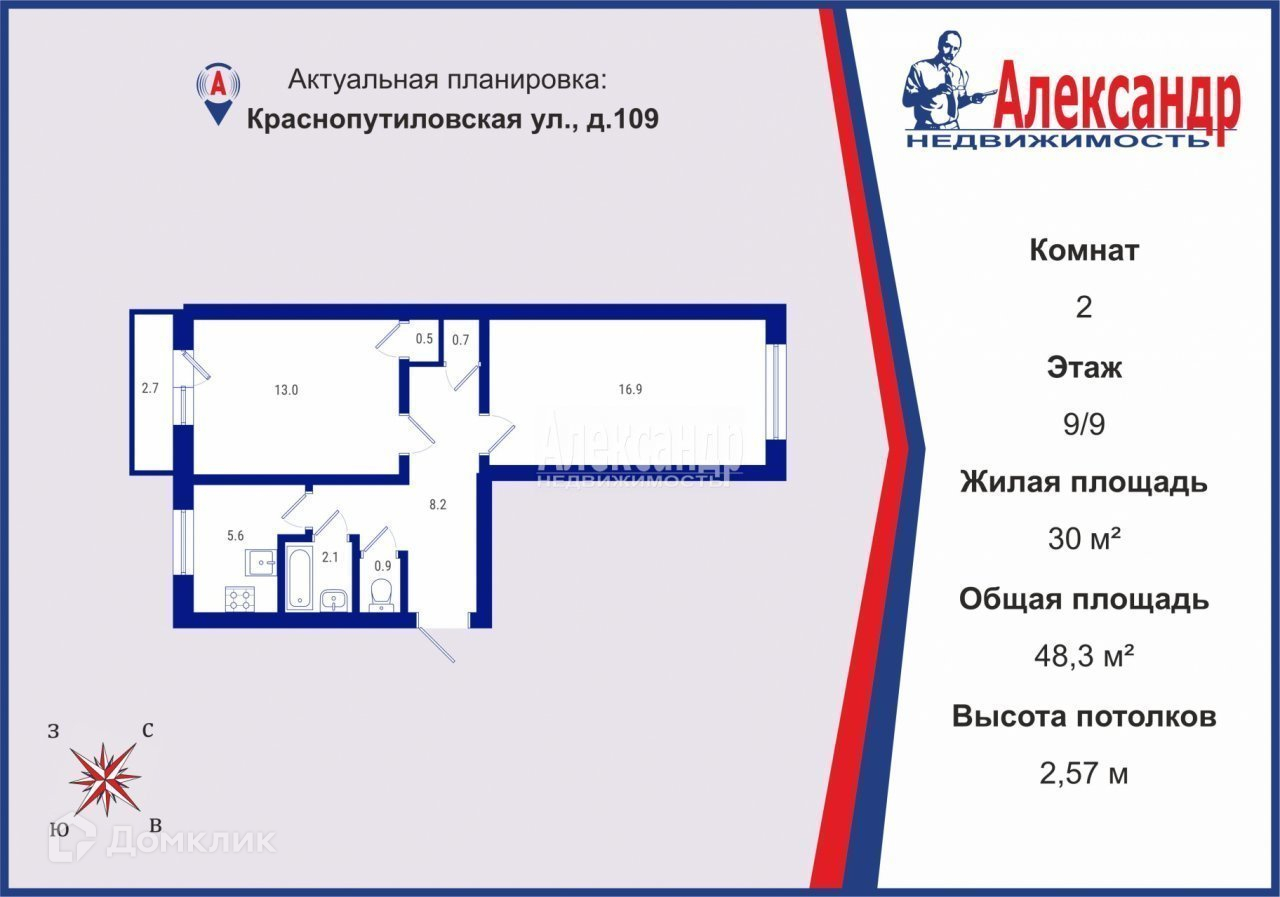 2-комнатная квартира, 48.3 м2, этаж 9 / 9, на продажу в Санкт-Петербурге, Краснопутиловская улица, 109