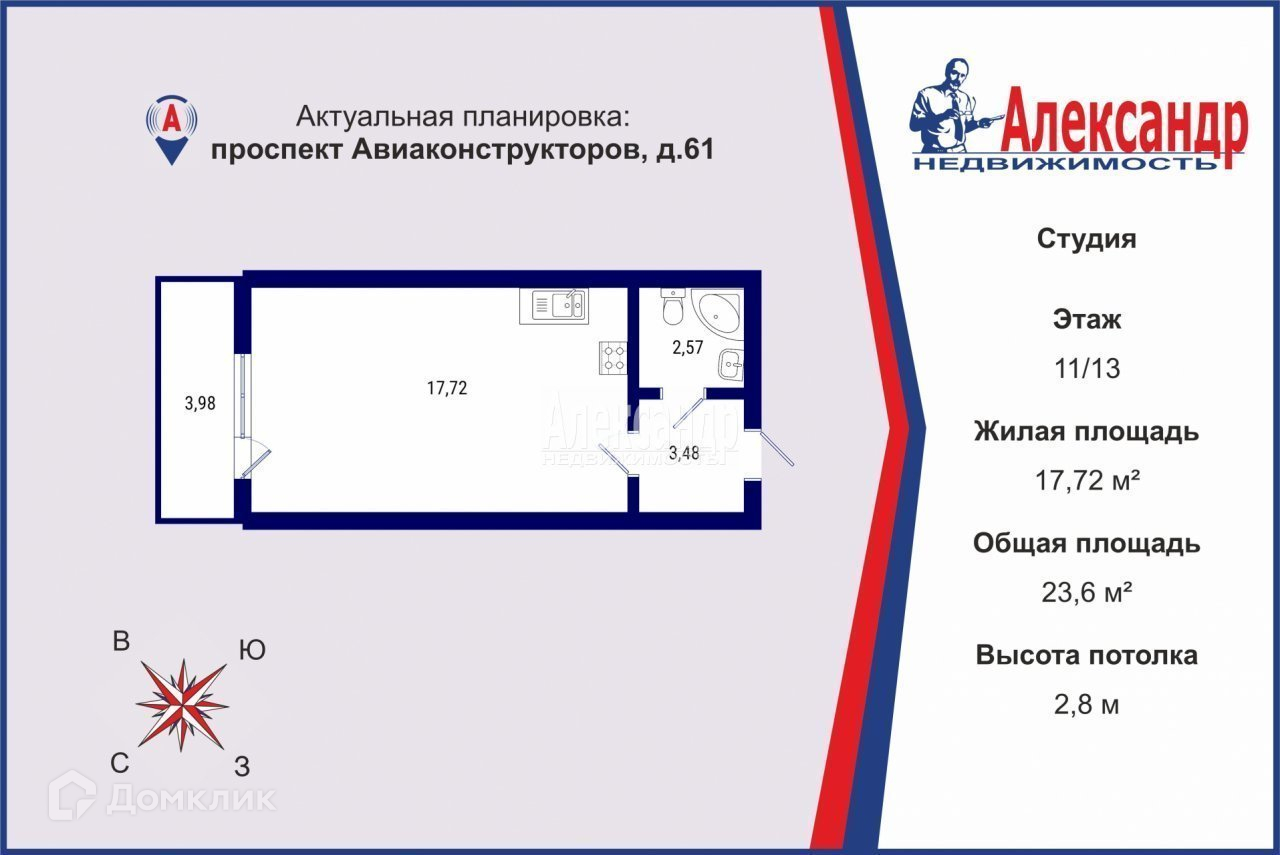 Квартира студия, 23.6 м2, этаж 11 / 13, на продажу в Санкт-Петербурге, проспект Авиаконструкторов, 61