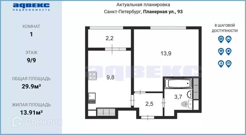 1-комнатная квартира, 29.9 м2, этаж 9 / 9, на продажу в Санкт-Петербурге, Планерная улица, 93