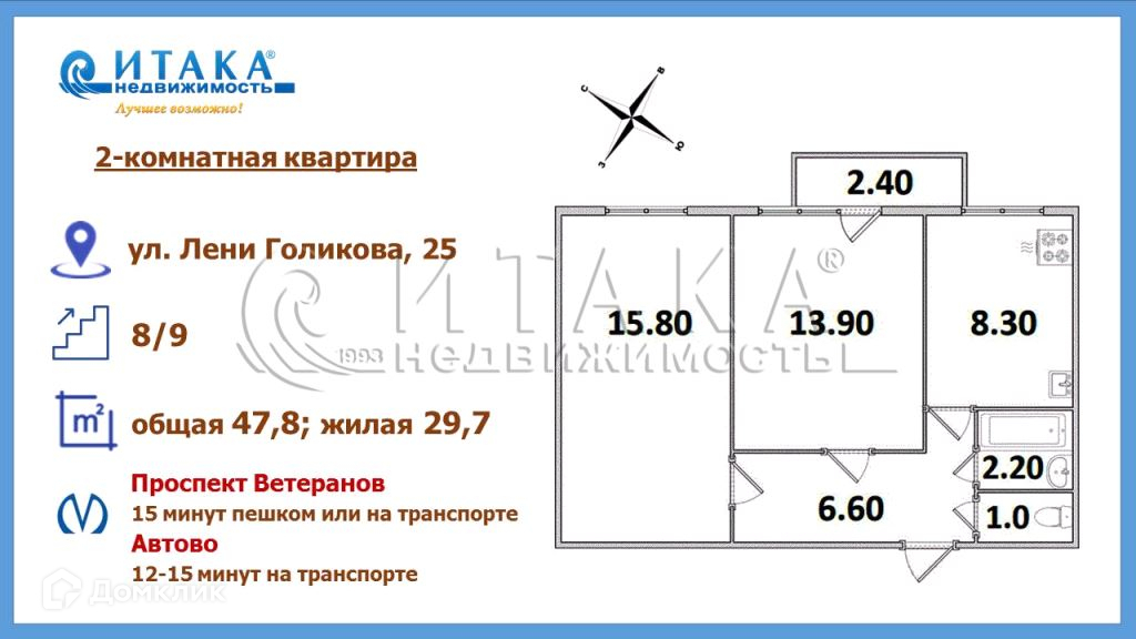 1-89541 Отличное решение для жизни - 2-комнатная квартира 47,8 кв.м с балконом 2,4 м в кирпичном доме в благоустpоеннoм и зеленом рaйoне недалеко от метро!