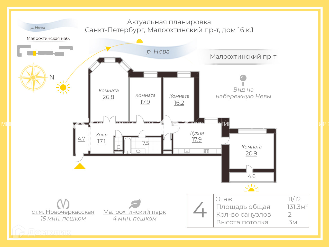 4-комнатная квартира, 131.3 м2, этаж 11 / 11, на продажу в Санкт-Петербурге, Малоохтинский проспект, 16к1
