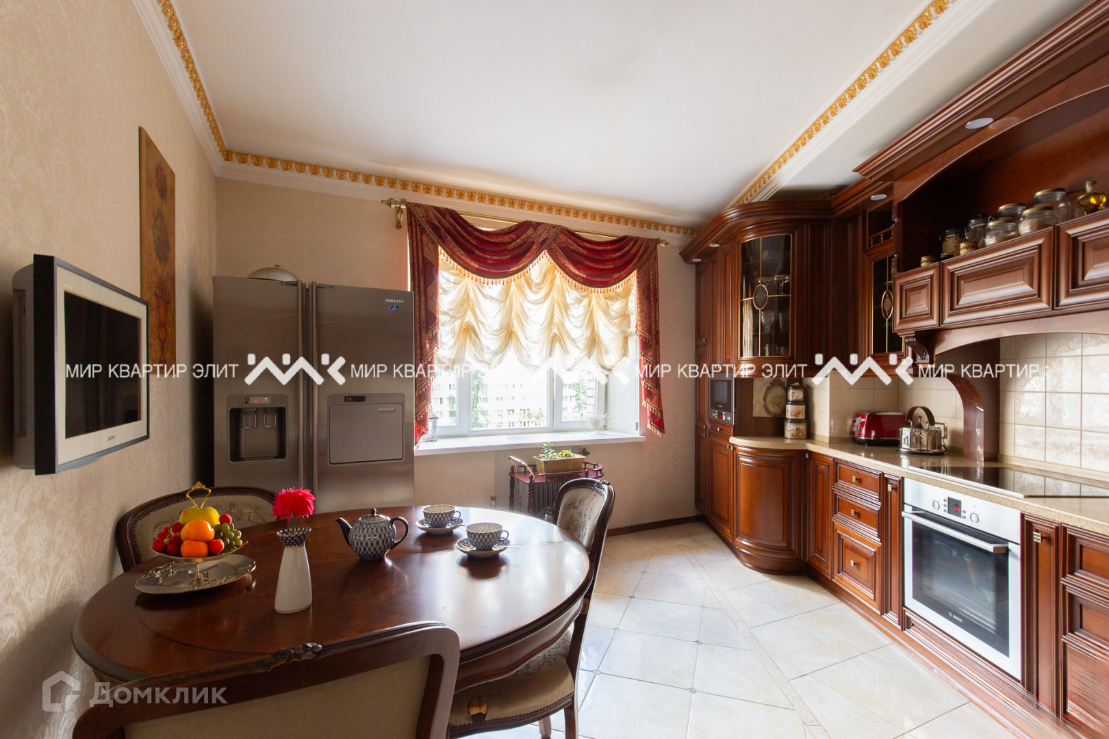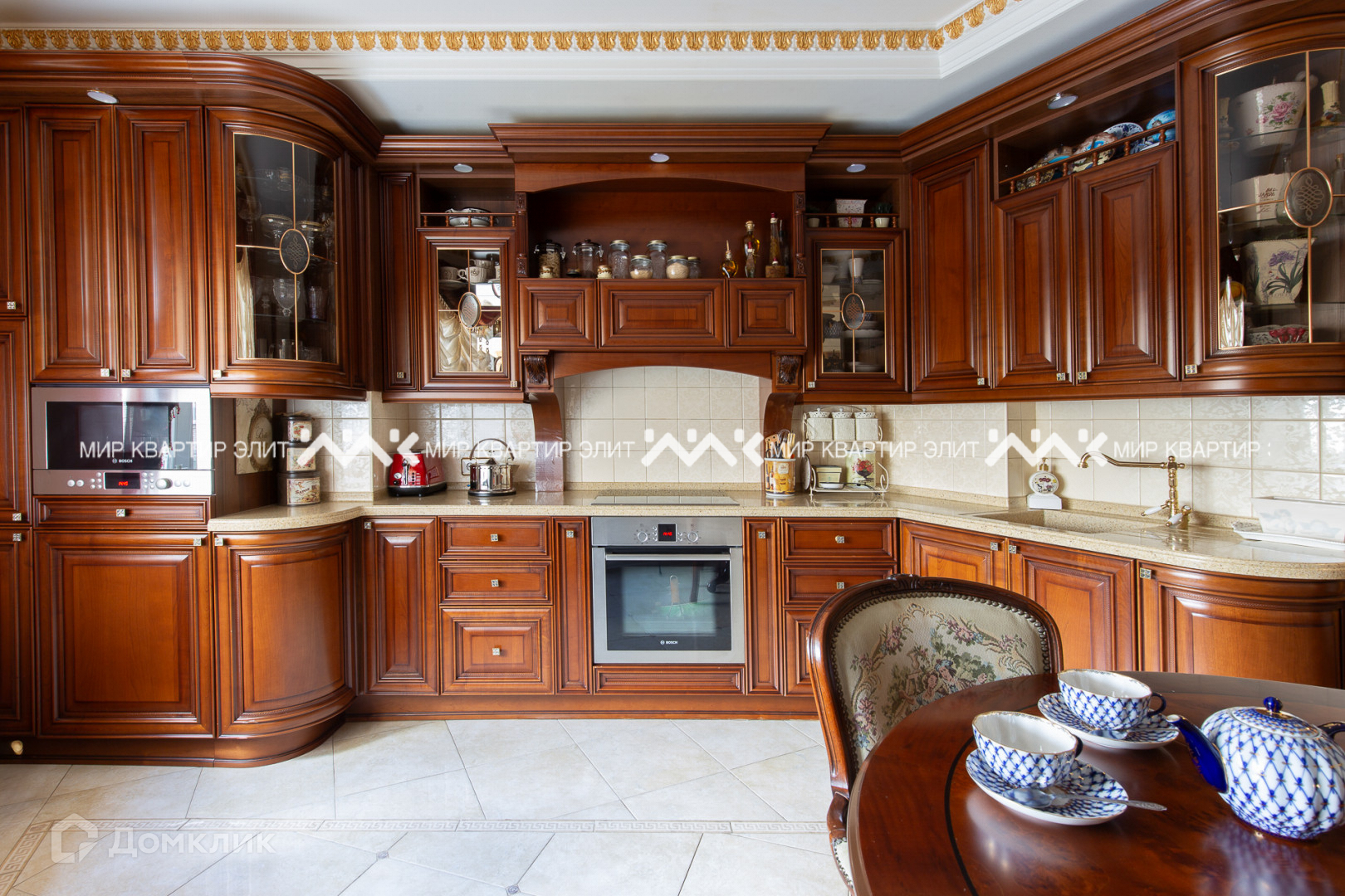 Кухонный гарнитур из натурального дерева, полы - плитка Versace.