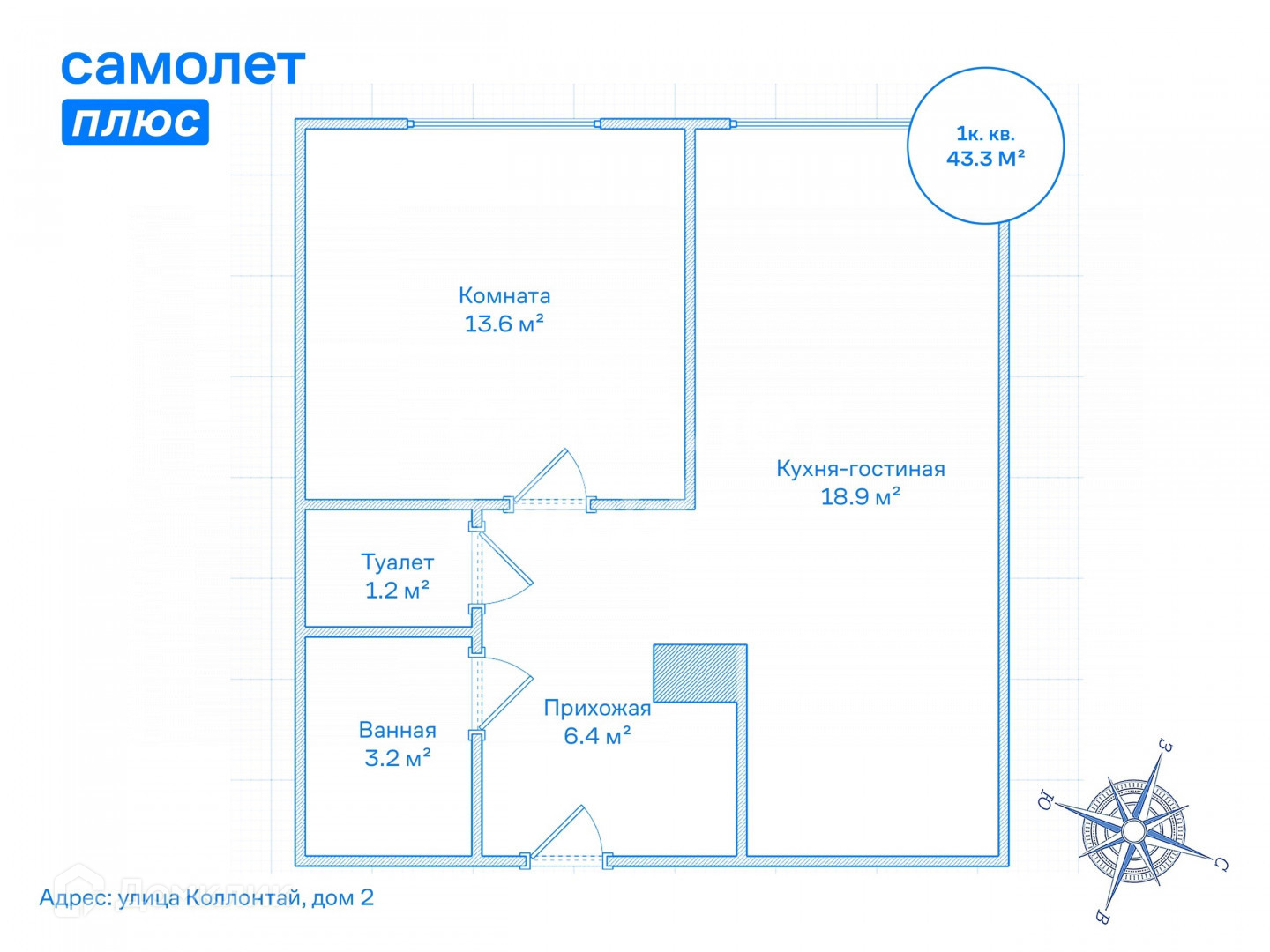 1-комнатная квартира, 43.7 м2, этаж 1 / 18, на продажу в Санкт-Петербурге, улица Коллонтай, 2