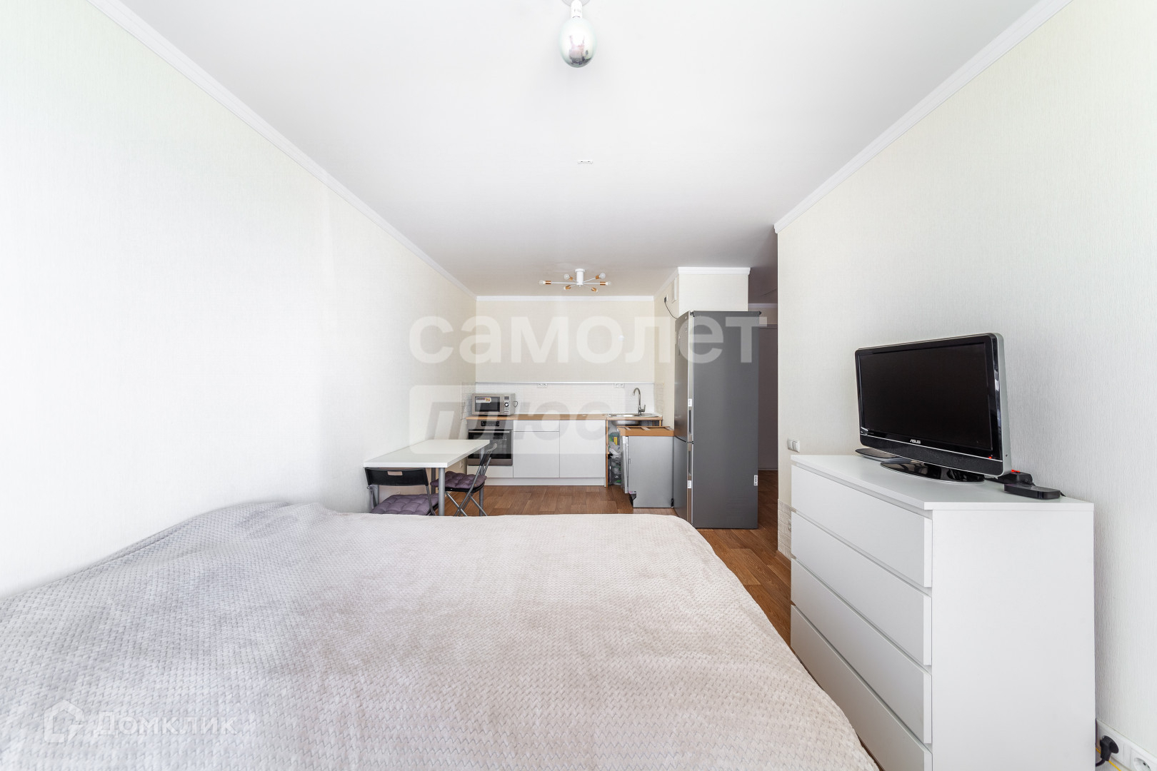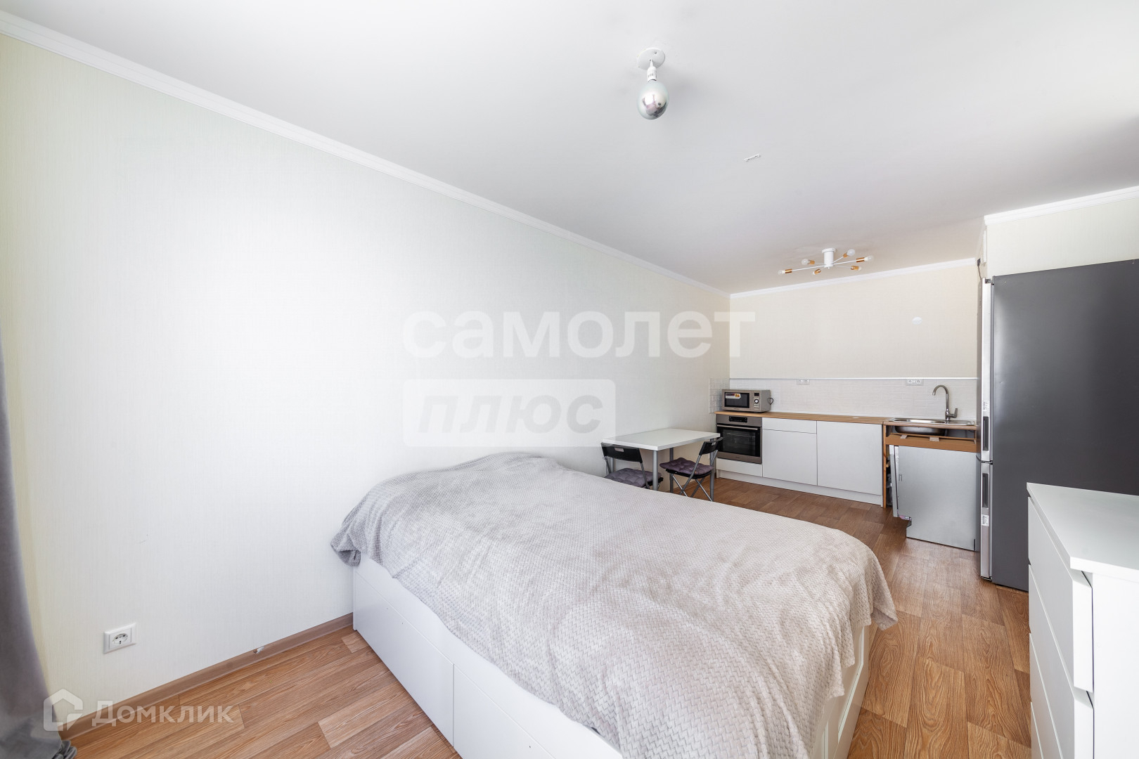 Внутри вы найдете спальню правильной квадратной формы, а также просторную кухню-гостиную с удобной планировкой.