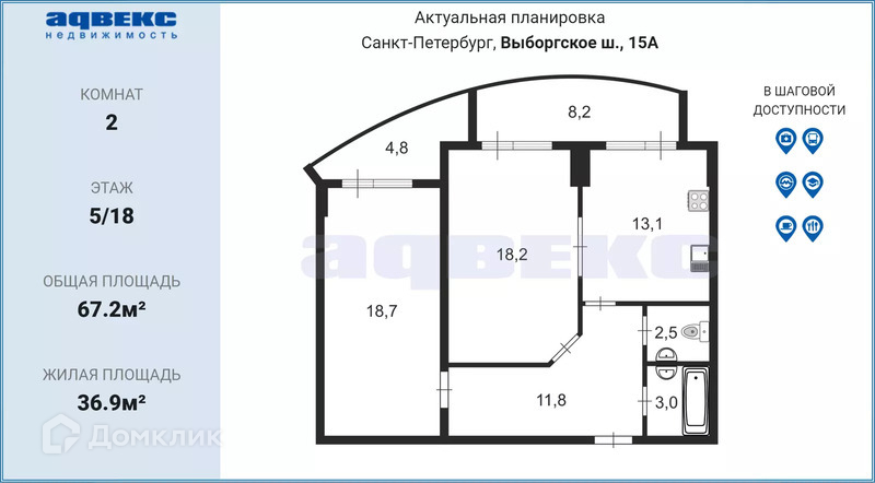 2-комнатная квартира, 67.2 м2, этаж 5 / 18, на продажу в Санкт-Петербурге, Выборгское шоссе, 15