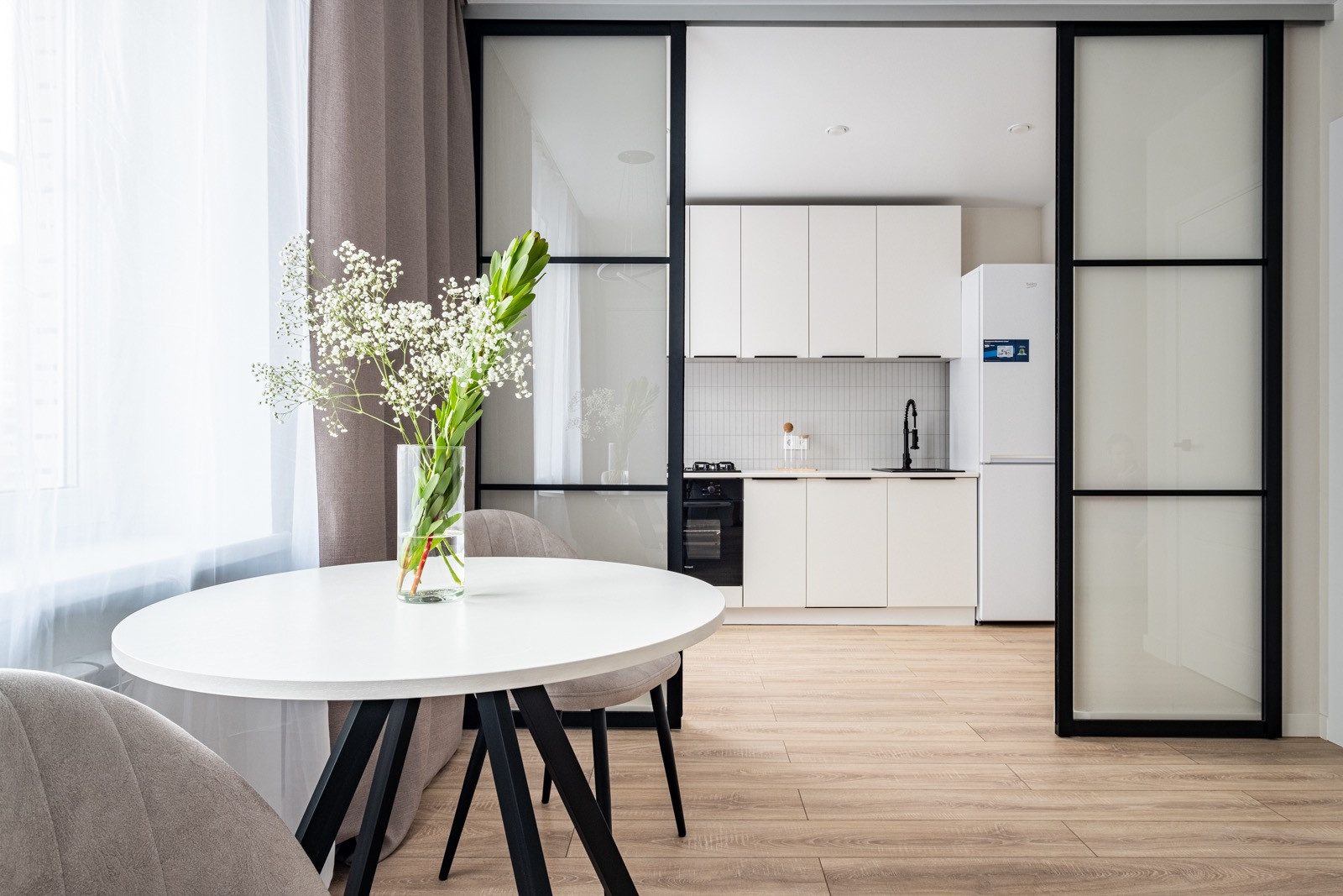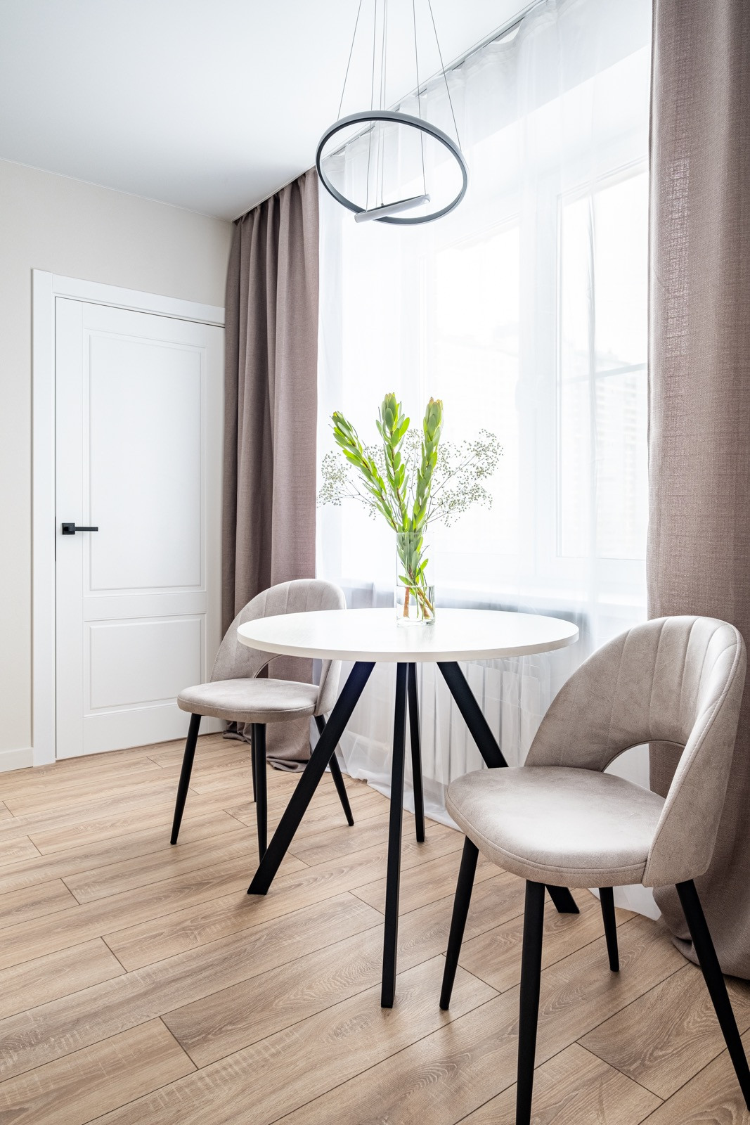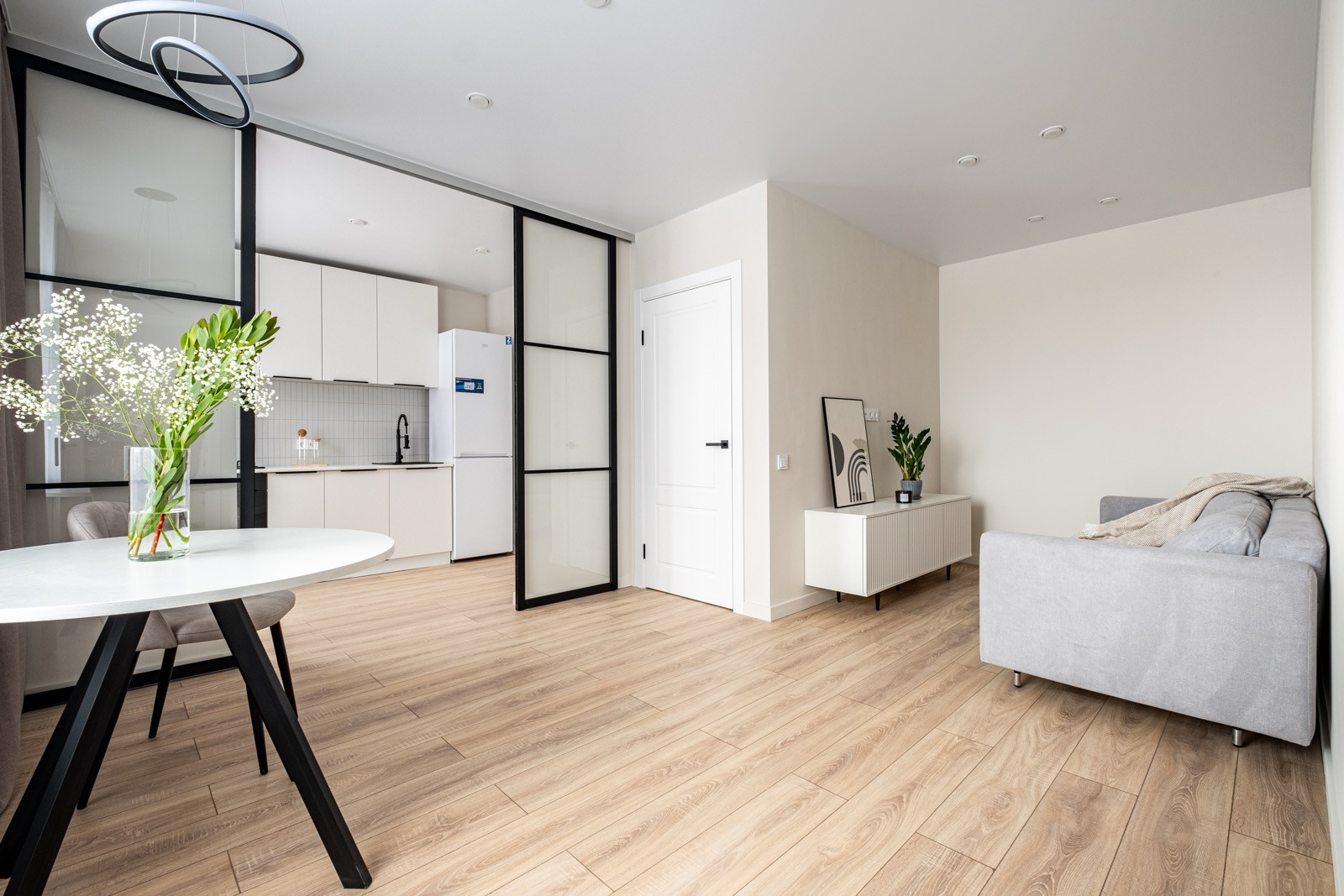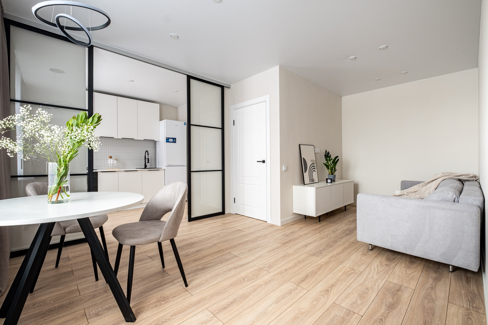+ Идеальная планировка для семьи из двух человек -  приватная зона спальни с гардеробом и просторная гостиная с кухней.