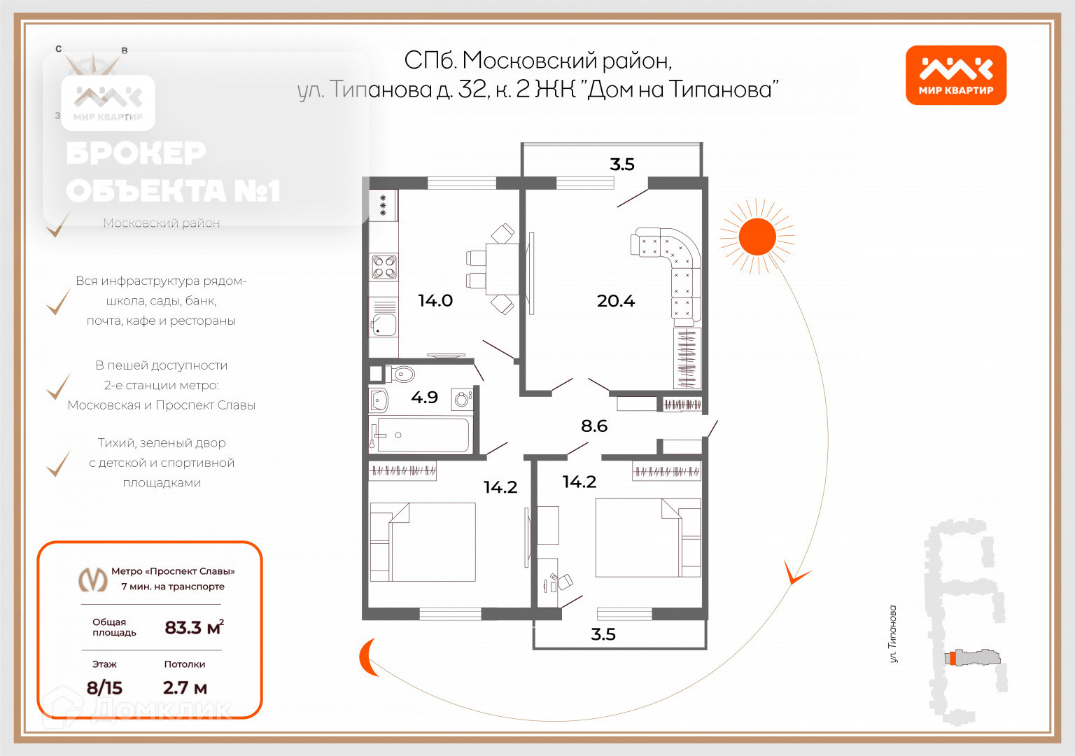 Арт. 71904966 В продаже счастливая 3 комнатная квартира в ЖК "Дом на Типанова", общей площадью 83,3 м2, на восьмом этаже.