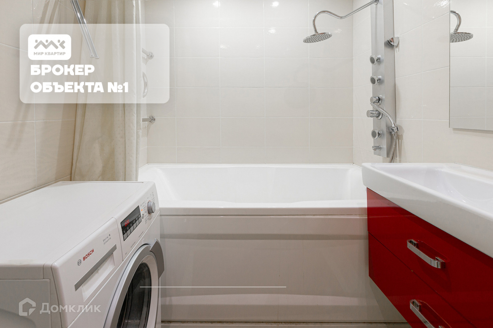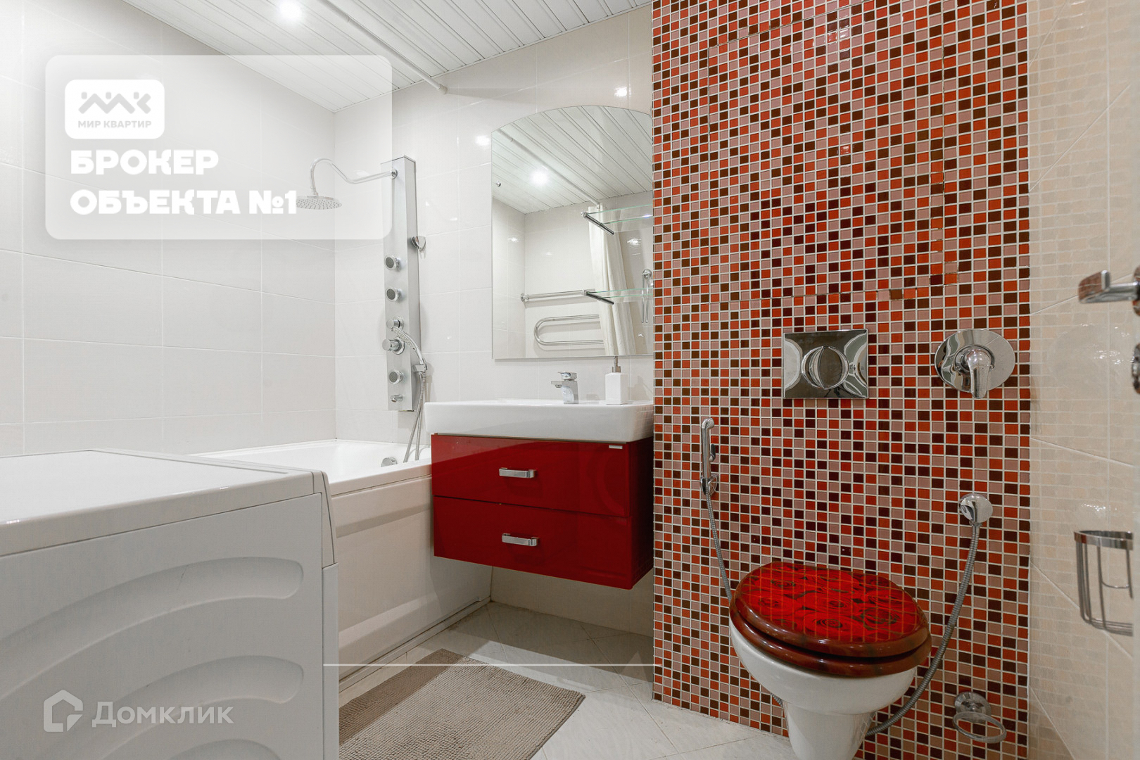 Ванная отделана белой плиткой, с ярким мазаичным пано, стиральной машиной и подогреваемыми полами.