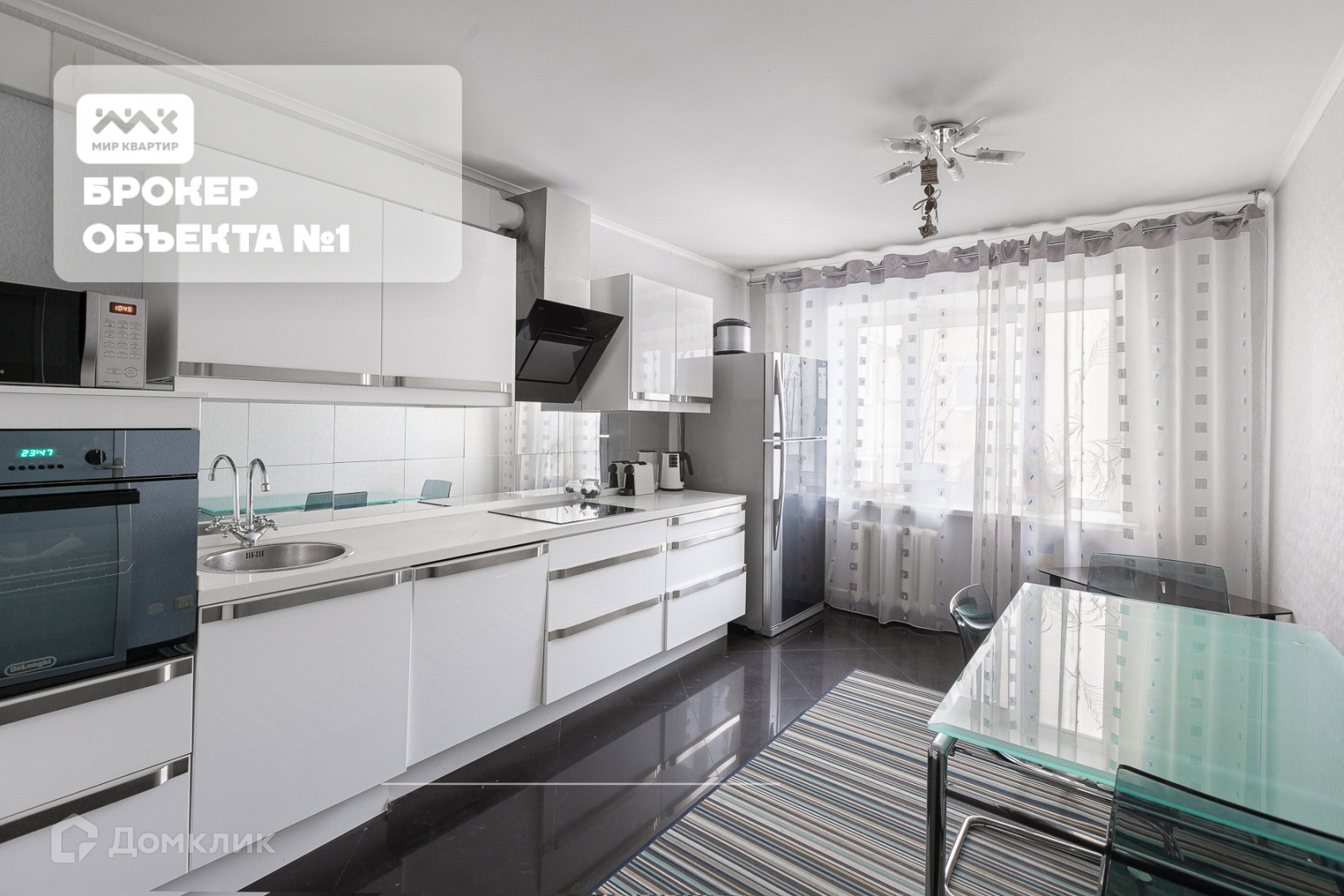 Сердце квартиры - кухня с большим окном, полностью оборудованная бытовой техникой (духовой шкаф, микроволновка, электрическая плита, вытяжка, посудомоечная машина, большой холодильник, капсульная кофемашина).