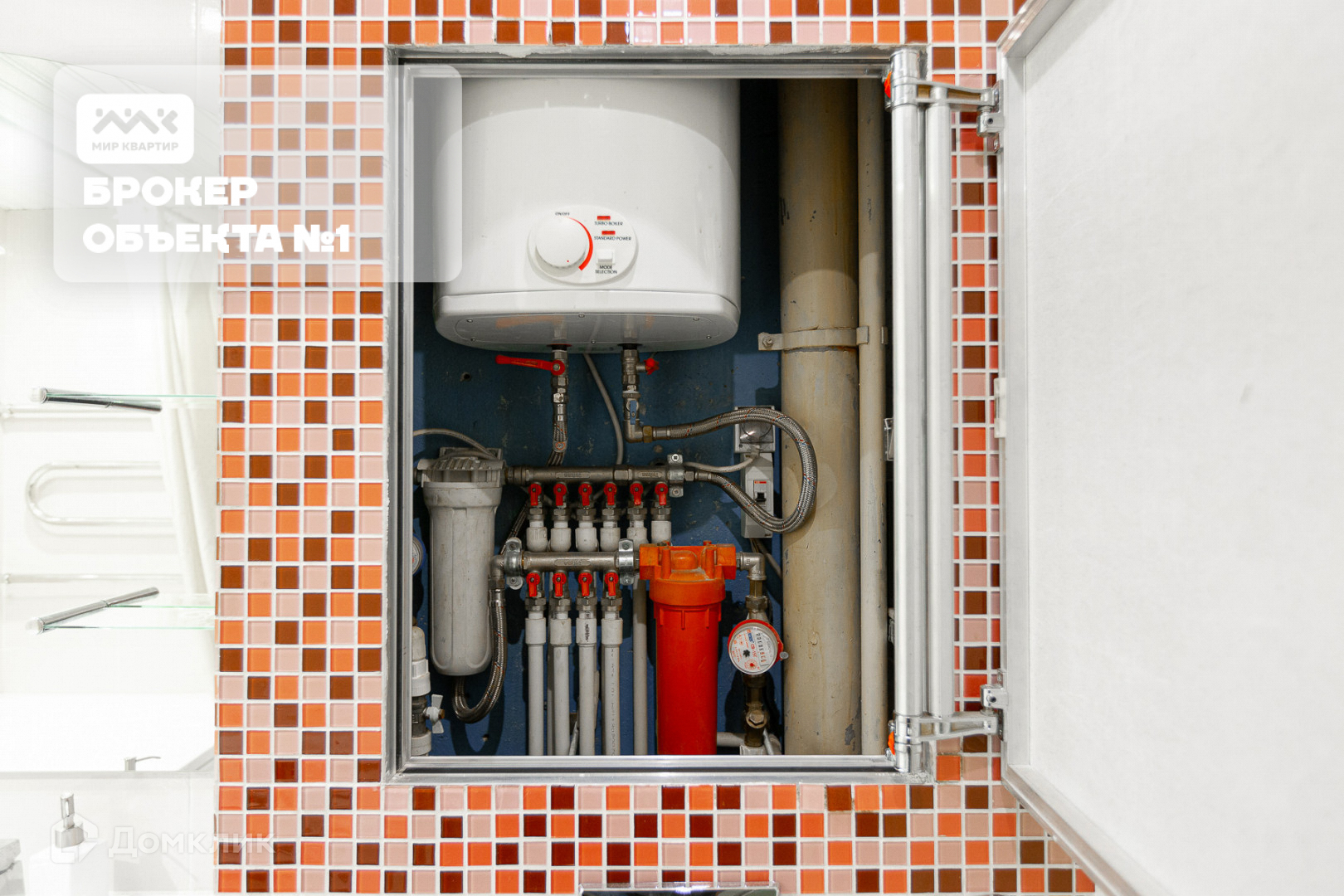 Резервный электрический водонагреватель с системой фильтрации холодной и горячей воды, скрыты от посторонних глаз потайной дверцей.