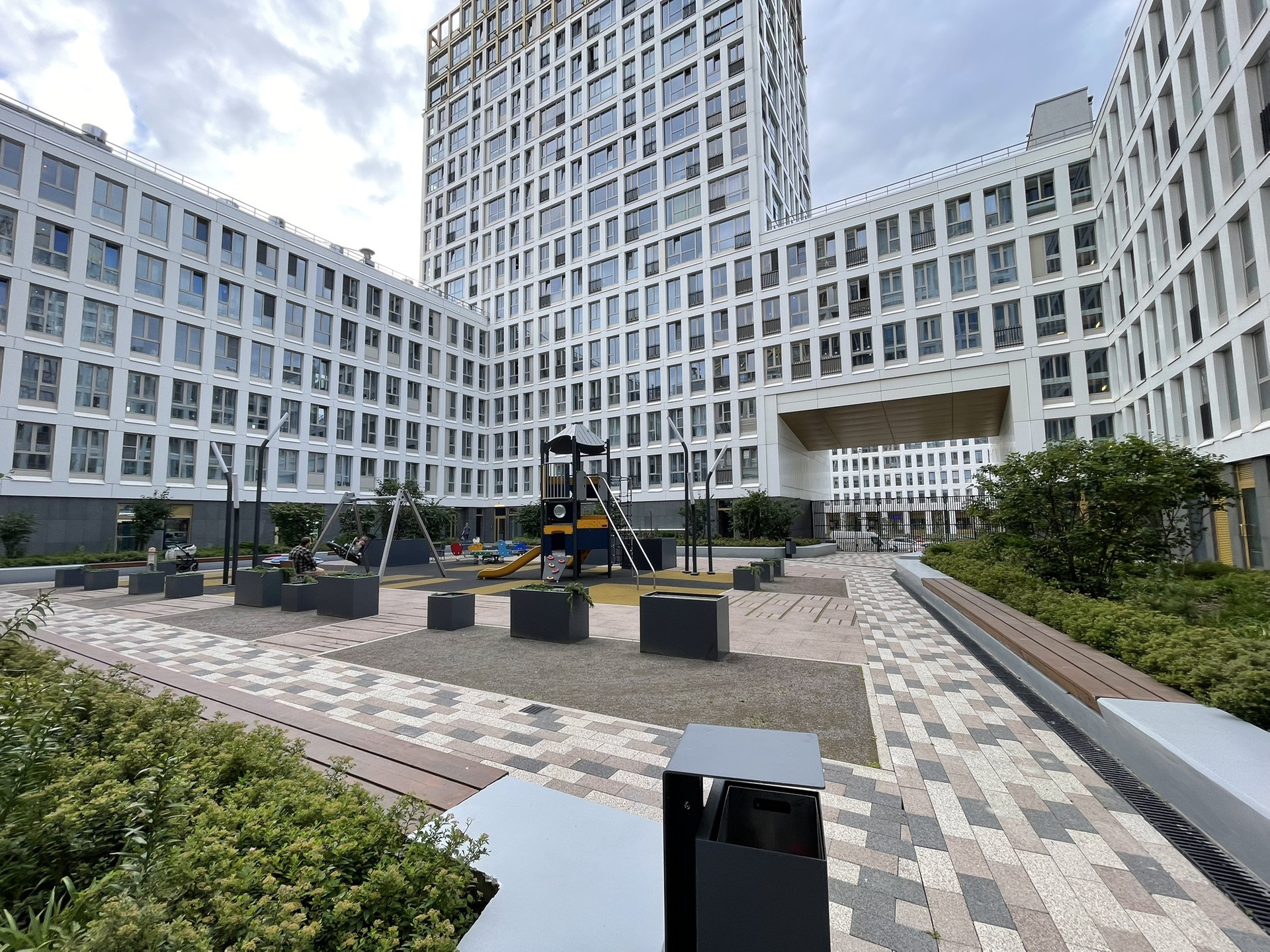 Во закрытом охраняемом дворе выполнен ландшафтный дизайн с общей видовой террасой, оборудованной лаунж-зонами.