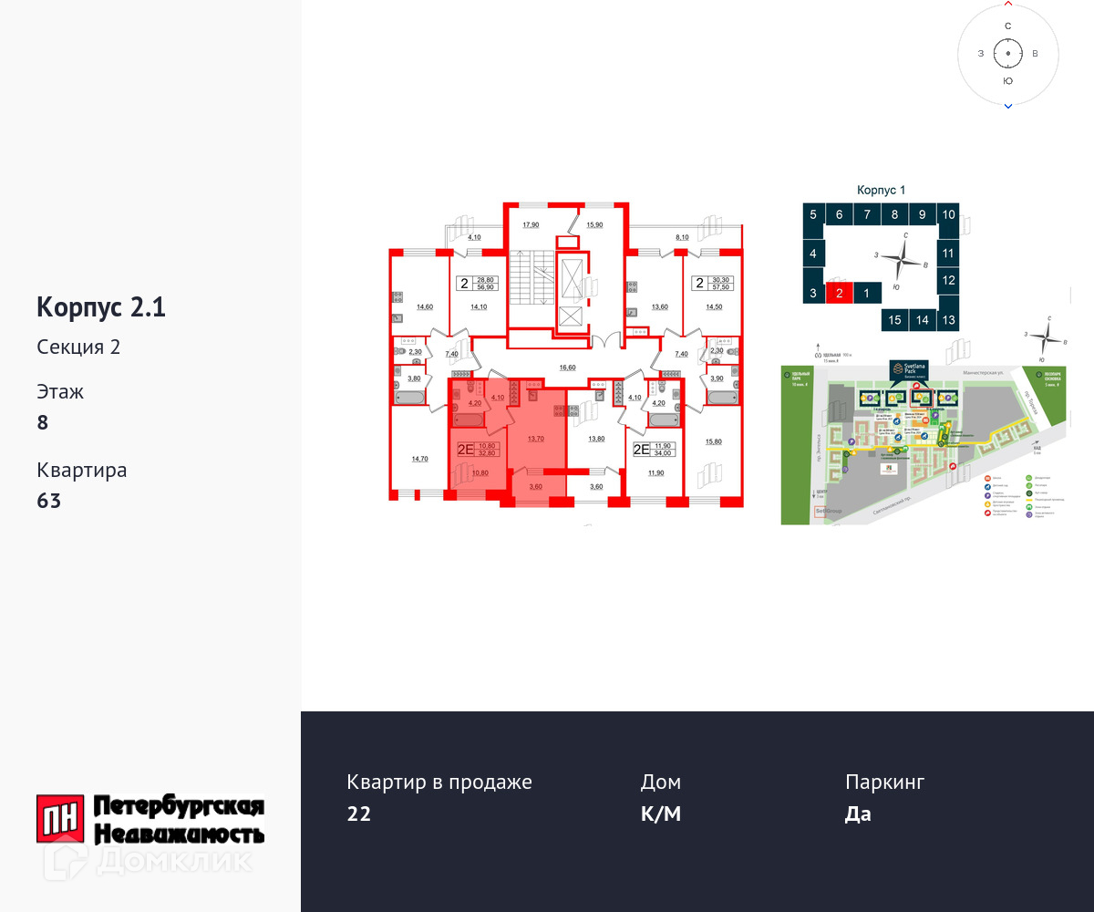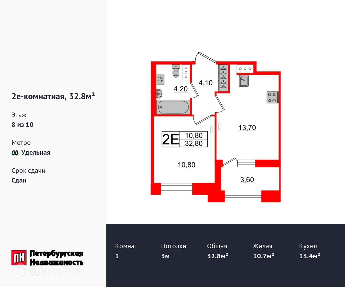 1-комнатная квартира, 32.8 м2, этаж 8 / 10, на продажу в Санкт-Петербурге, Манчестерская улица, 5к1