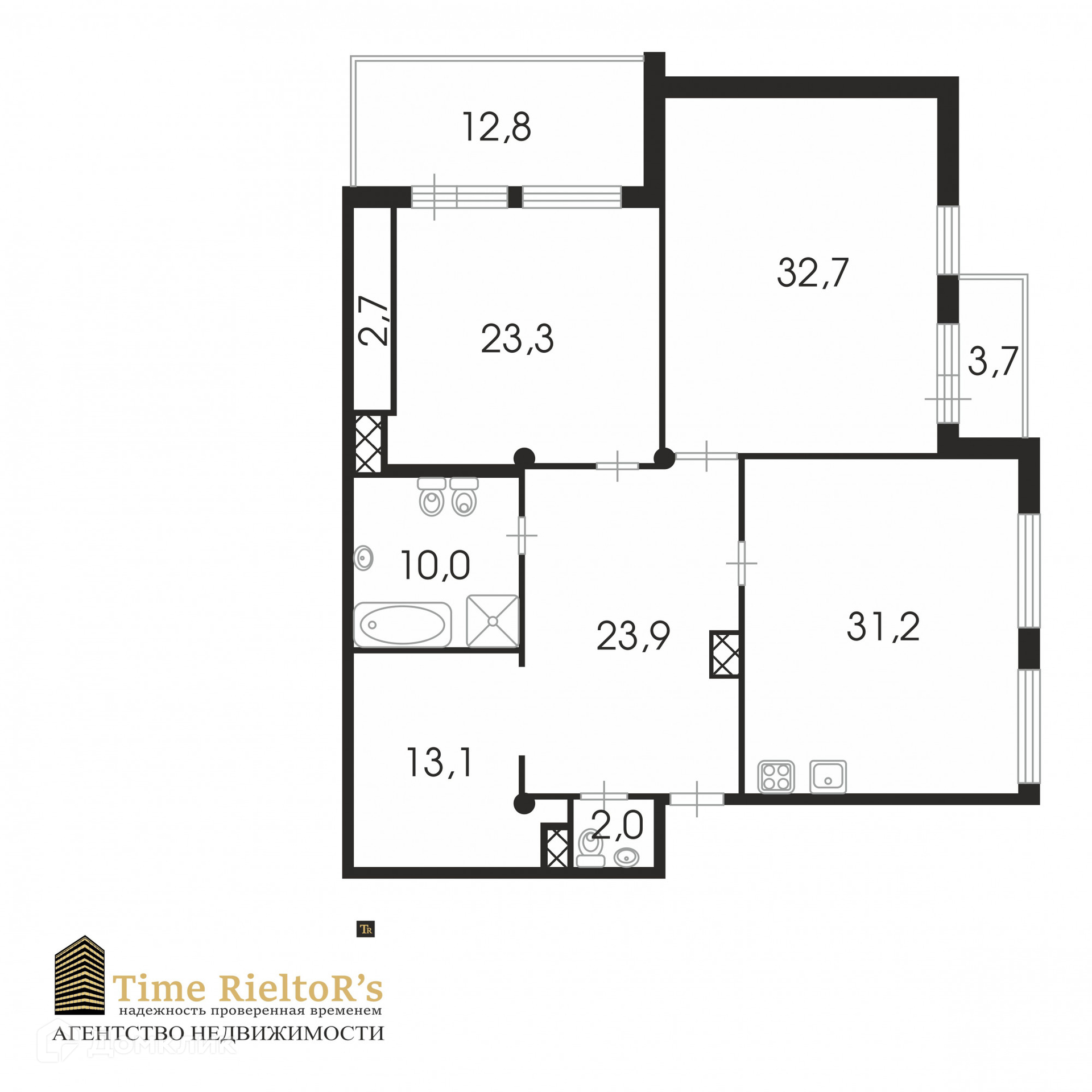 Две спальни 32,7 и 32,3 кв.м, кухня гостиная 31,2 кв.м.