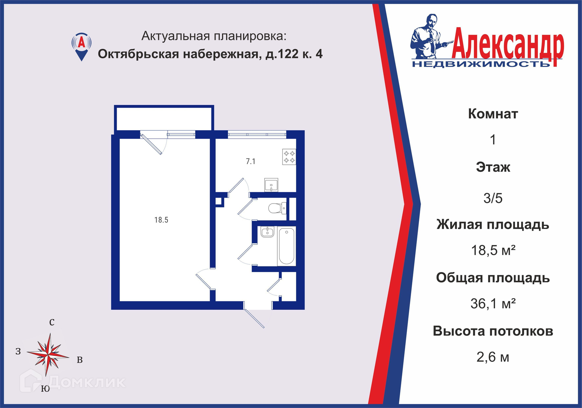 1-комнатная квартира, 36.1 м2, этаж 3 / 5, на продажу в Санкт-Петербурге, Октябрьская набережная, 122к4