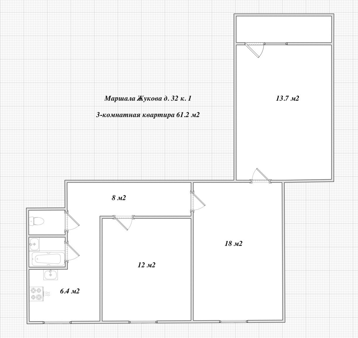 3-комнатная квартира, 61.2 м2, этаж 6 / 9, на продажу в Санкт-Петербурге, проспект Маршала Жукова, 32к1