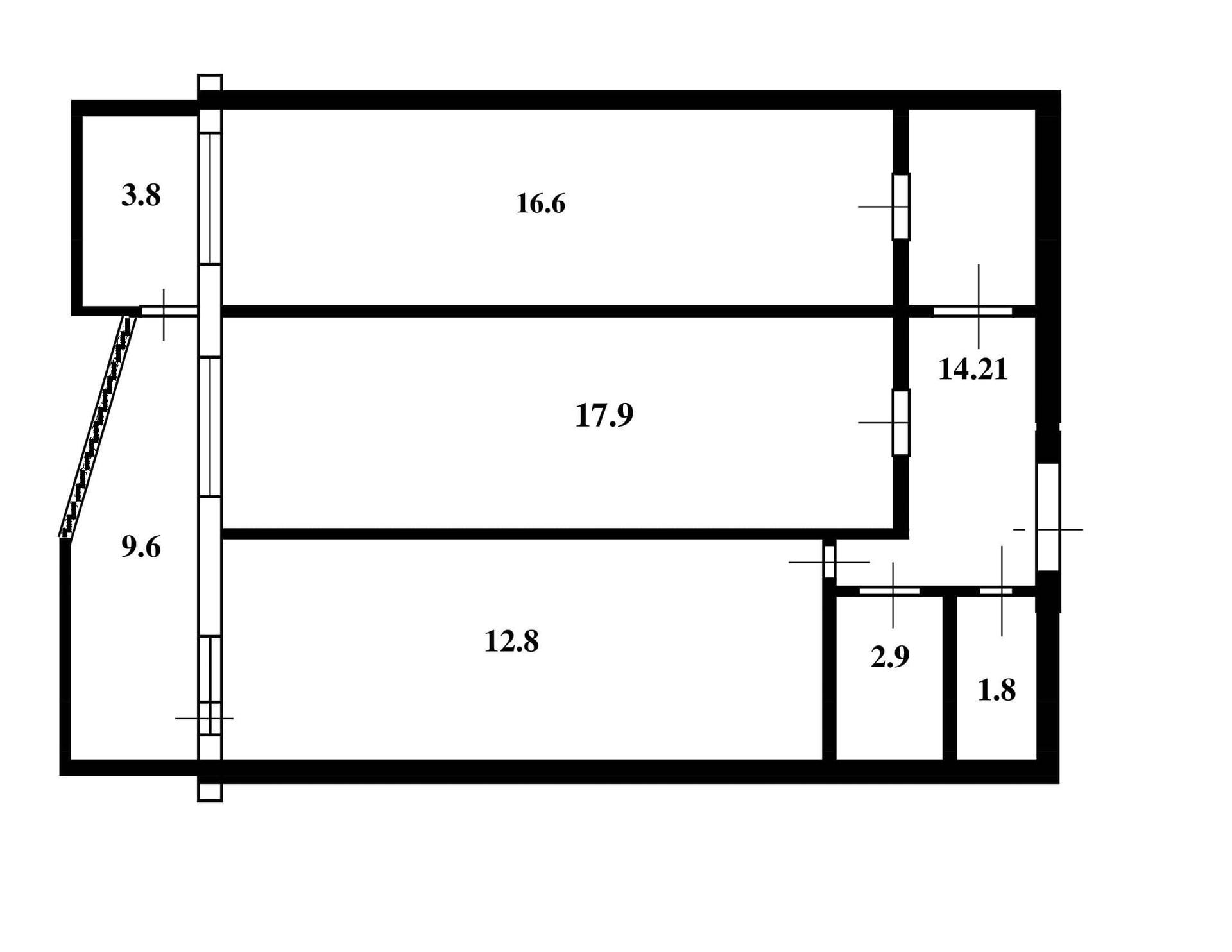 общая площадь      63, кв.м ( без учета метража 2х балконов 9,6+3,8 кв.м)