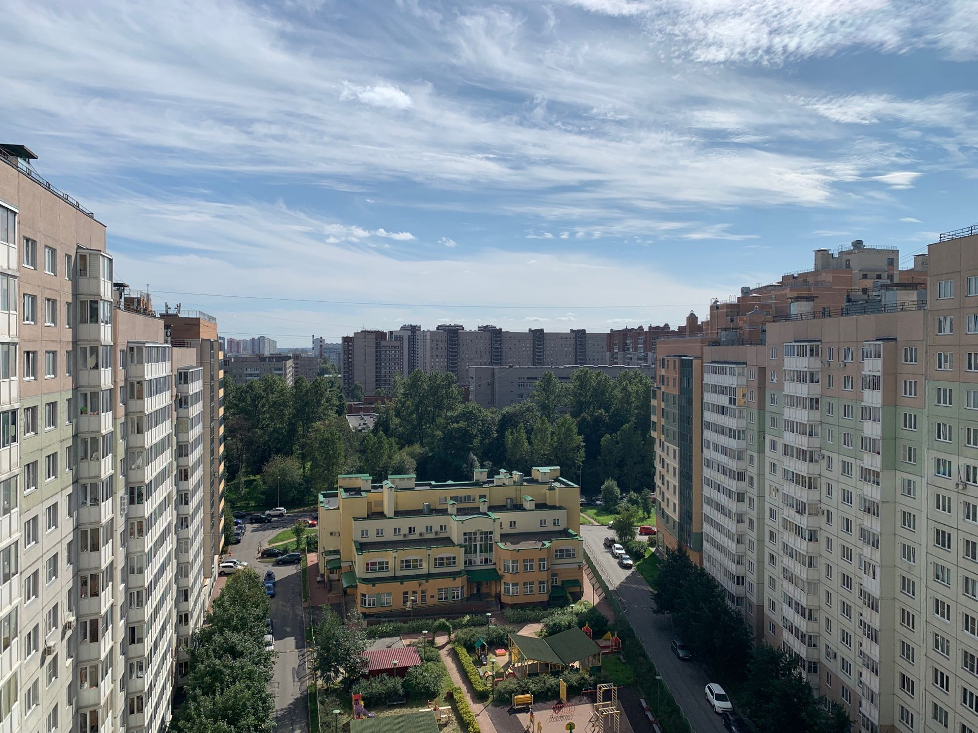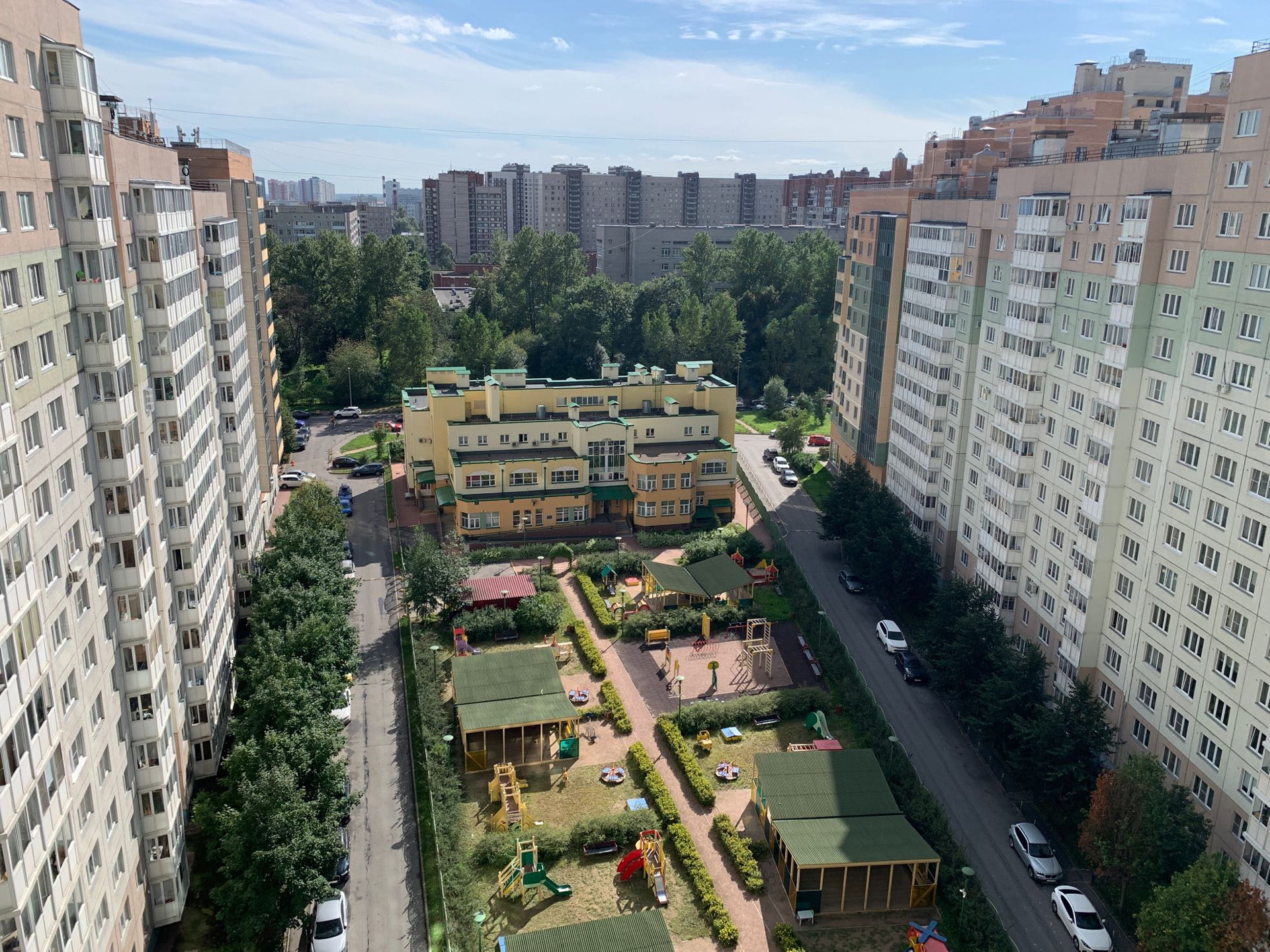 Зеленый двор. Прекрасная аллея для утренних пробежек. Для прогулок пешком можно дойти до Пулковского парка, на машине 10 мин до парка Победы, 25 мин до Пушкина.
