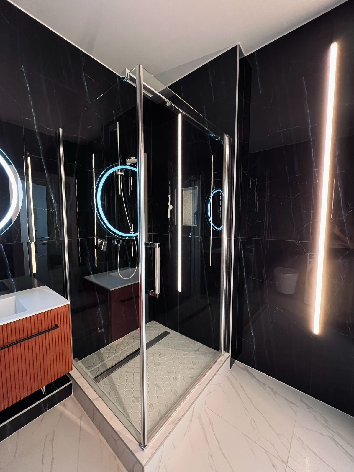 В ванной комнате проложен теплый пол.