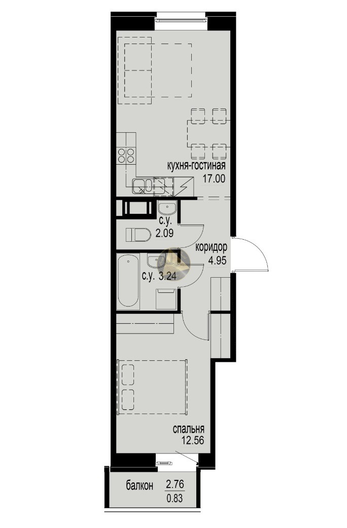 ⚡️ Квартира находится на 4/12 этаже. Просторная кухня-гостиная 17,00м2 Светлая спальня 12,56 м2 с балконом 2,76м2 с ВИДОМ на Удельный парк. Коридор 4,95м2. Санузел: 2,09м2 + 3,24м2